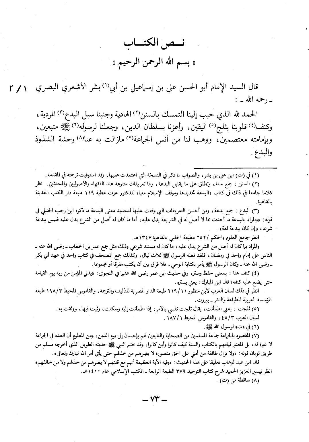 قال السيد الإمام أبو الحسن علي بن إسماعيل بن أبي1 بشر الأشعري البصري - رحمه الله -: