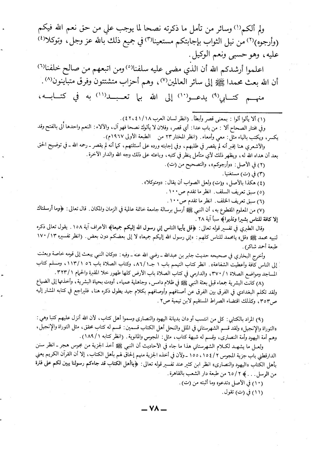 اعلموا - أرشدكم الله - أن الذي مضى عليه سلفنا5 ومن تبعهم من صالح خلفنا6 أن الله بعث محمداً صلى الله عليه وسلم إلى سائر العالمين7، وهم أحزاب متشتتون وفرق متباينون8. منهم كتابي9 يدعو10 إلى الله بما تعبد11 به في كتابه،