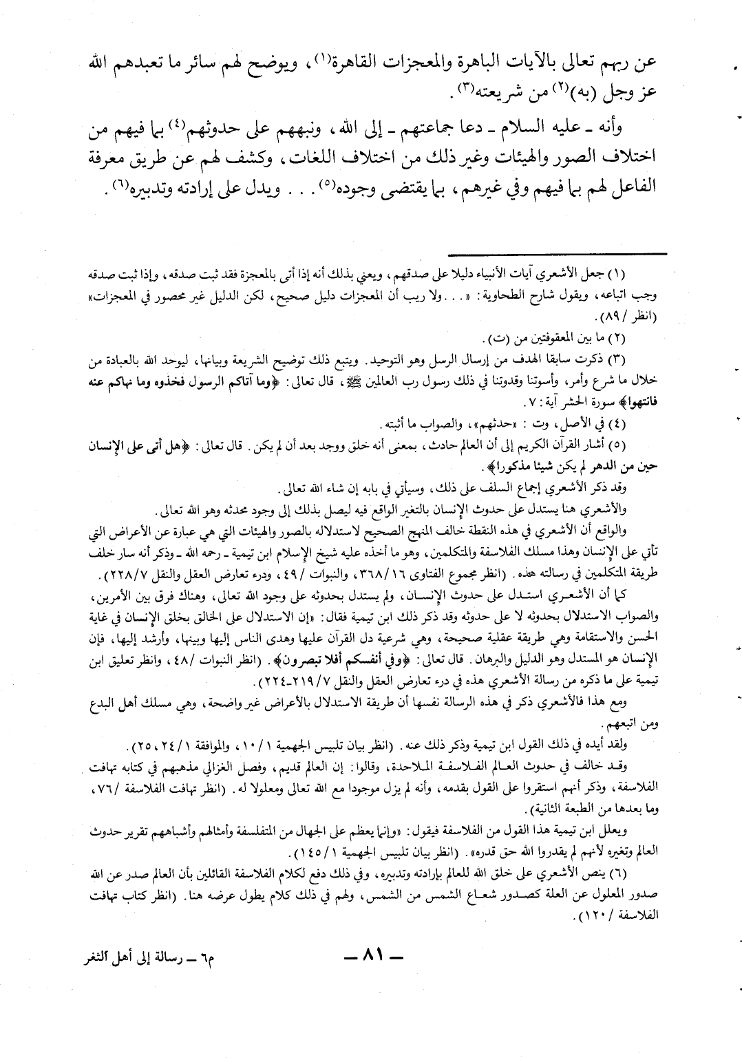 6 ينص الأشعري على خلق الله للعالم بإرادته وتدبيره، وفي ذلك دفع لكلام الفلاسفة القائلين بأن العالم صدر عن الله صدور المعلول عن العلة كصدور شعاع الشمس من الشمس، ولهم في ذلك كلام يطول عرضه هنا. (انظر: كتاب تهافت الفلاسفة ص120) .