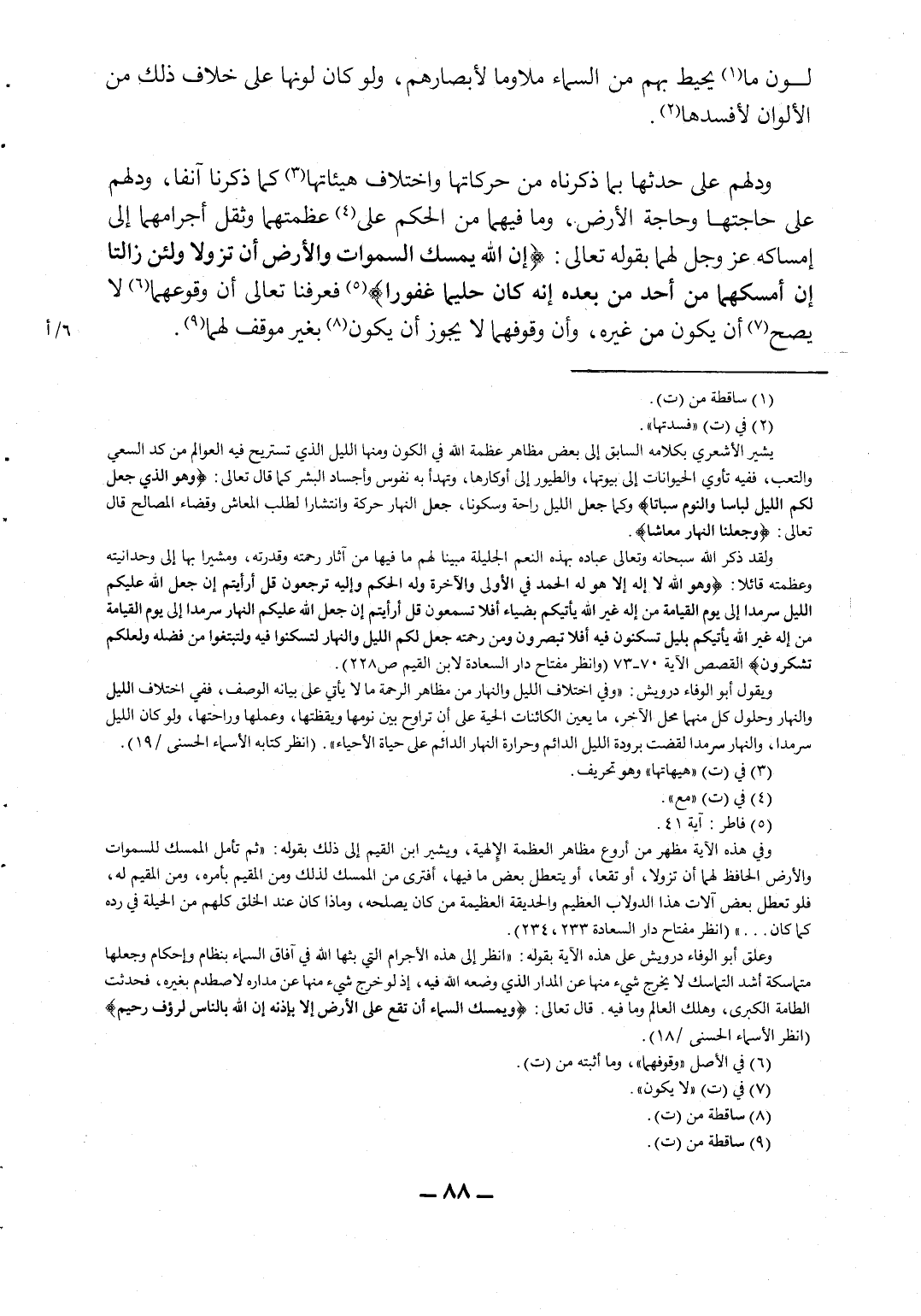 ودلهم على حدثها بما ذكرناه من حركاتها واختلاف هيئاتها3 كما ذكرنا آنفاً، ودلهم على حاجتها وحاجة الأرض، وما فيهما من الحكم على4 عظمتهما وثقل أجرامهما إلى إمساكه عز وجل لهما بقوله تعالى: {إِنَّ اللَّهَ يُمْسِكُ السَّمَاوَاتِ وَالأَرْضَ أَنْ تَزُولا وَلَئِنْ زَالَتَا إِنْ أَمْسَكَهُمَا مِنْ أَحَدٍ مِنْ بَعْدِهِ إِنَّهُ كَانَ حَلِيماً غَفُوراً} 5.