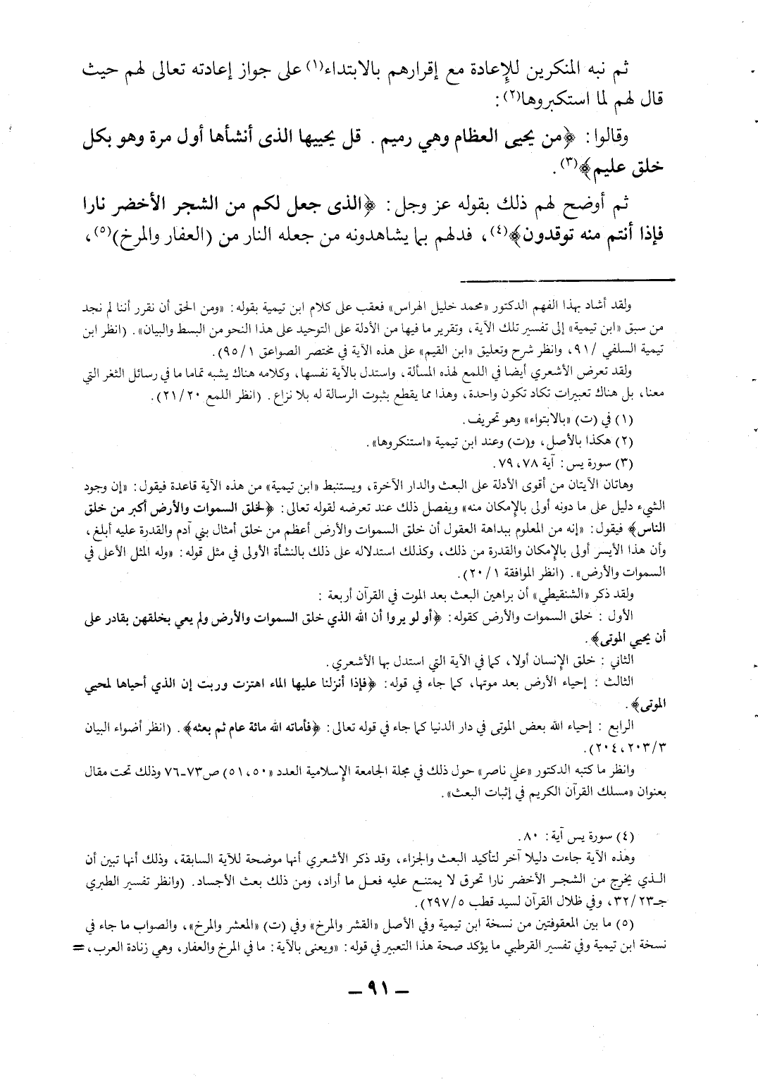 5 ما بين المعقوفتين من نسخة ابن تيمية وفي الأصل "القشر والمرخ" وفي (ت) "المعشر والمرخ"، والصواب ما جاء في نسخة ابن تيمية، وفي تفسير القرطبي ما يؤكد صحة هذا التعبير في قوله: "ويعني بالآية: ما في المرخ والعفار، وهي زنادة العرب، ومنه قولهم: في كل شجر نار واستمجد المرخ والعفار، فالعفار الزند وهو الأعلى، والمرخ الزندة وهي الأسفل…". (انظر: تفسير القرطبي 15/59، 60، وابن كثير 6/581) .