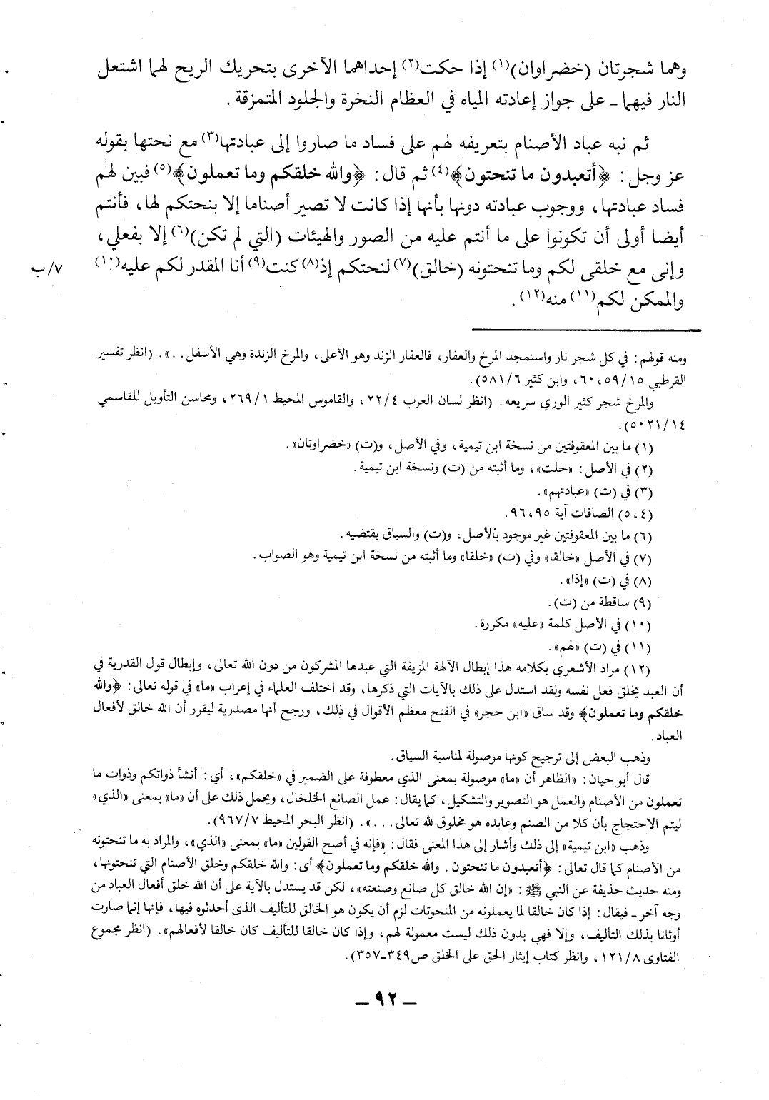 12 مراد الأشعري بكلامه هذا إبطال الآلهة المزيفة التي عبدها المشركون من دون الله تعالى، وإبطال قول القدرية في أن العبد يخلق فعل نفسه، ولقد استدل على ذلك بالآيات التي ذكرها، وقد اختلف العلماء في إعراب "ما" في قوله تعالى: {وَاللَّهُ خَلَقَكُمْ وَمَا تَعْمَلُونَ} وقد ساق "ابن حجر" في الفتح معظم الأقوال في ذلك، ورجح أنها مصدرية ليقرر أن الله خالق لأفعال العباد.