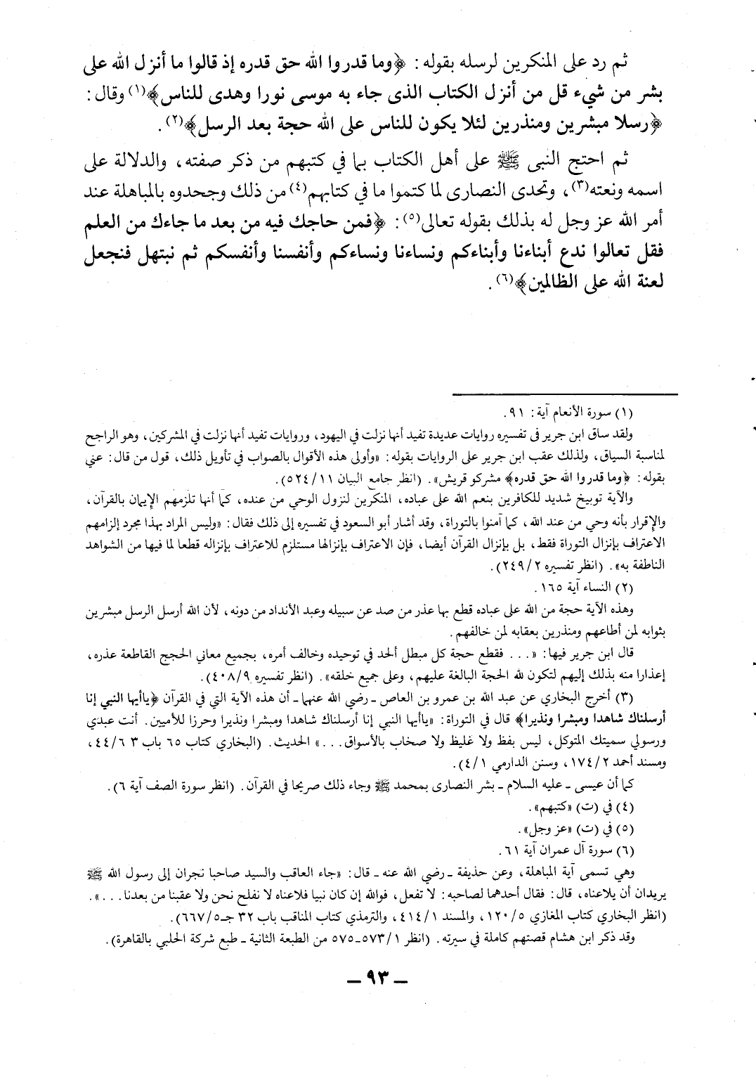 ثم احتج النبي صلى الله عليه وسلم على أهل الكتاب بما في كتبهم من ذكر صفته، والدلالة على اسمه ونعته3، وتحدى النصارى لما كتموا ما في كتبهم4 من ذلك وجحدوه بالمباهلة عند أمر الله عز وجل له بذلك بقوله تعالى5: {فَمَنْ حَاجَّكَ فِيهِ مِنْ بَعْدِ مَا جَاءَكَ مِنَ الْعِلْمِ فَقُلْ تَعَالَوْا نَدْعُ أَبْنَاءَنَا وَأَبْنَاءَكُمْ وَنِسَاءَنَا وَنِسَاءَكُمْ وَأَنْفُسَنَا وَأَنْفُسَكُمْ ثُمَّ نَبْتَهِلْ فَنَجْعَلْ لَعْنَتَ اللَّهِ عَلَى الْكَاذِبِينَ} 6.