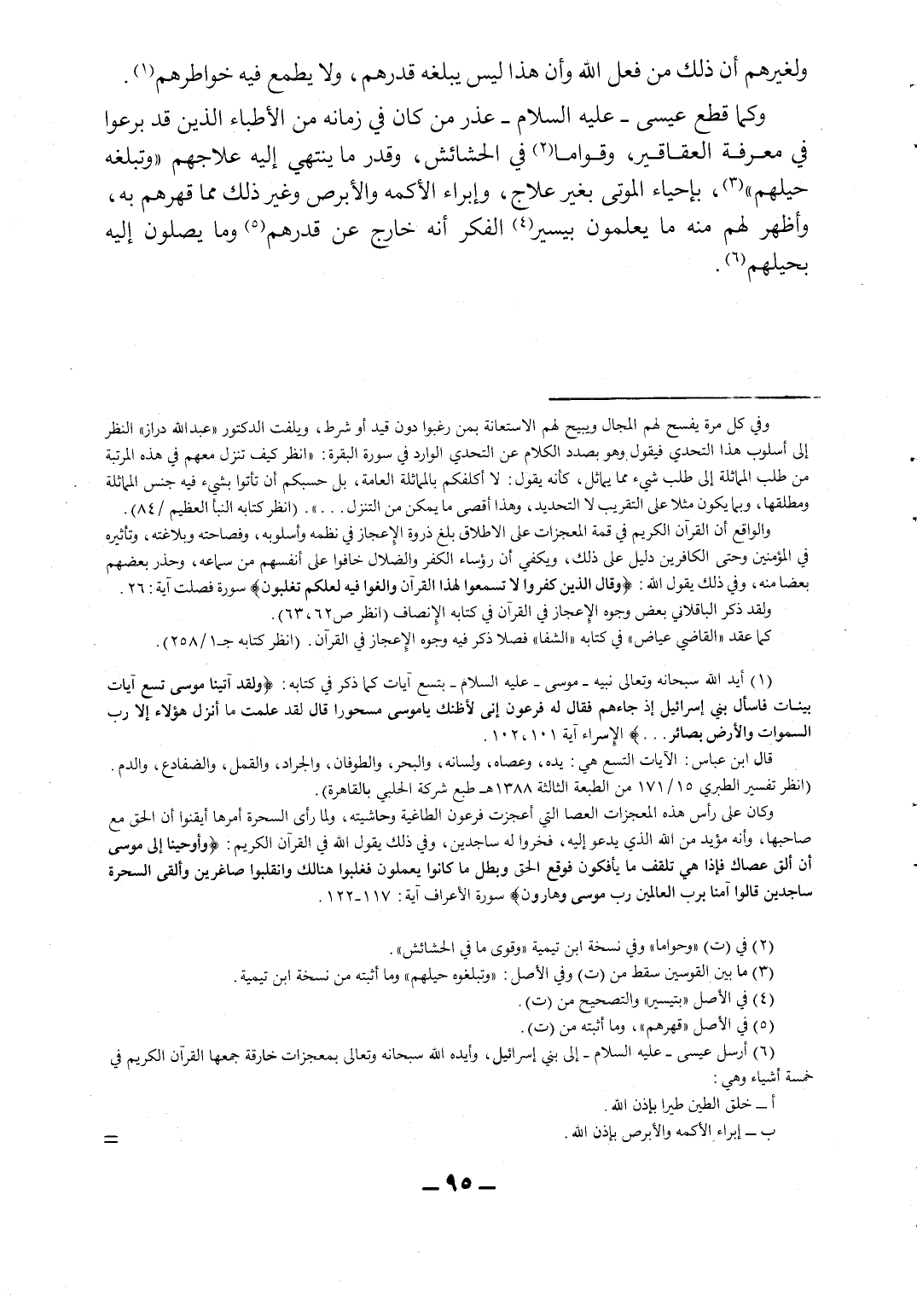 وكما قطع عيسى عليه السلام عذر من كان في زمانه من الأطباء الذين قد برعوا في معرفة العقاقير، وقواماً2 في الحشائش، وقدر ينتهي إليه علاجهم "وتبلغه حيلهم"3، بإحياء الموتى بغير علاج، وإبراء الأكمه والأبرص وغير ذلك مما قهرهم به، وأظهر لهم منه ما يعلمون بيسير4 الفكر أنه خارج عن قدرهم5 وما يصلون إليه بحيلهم6.