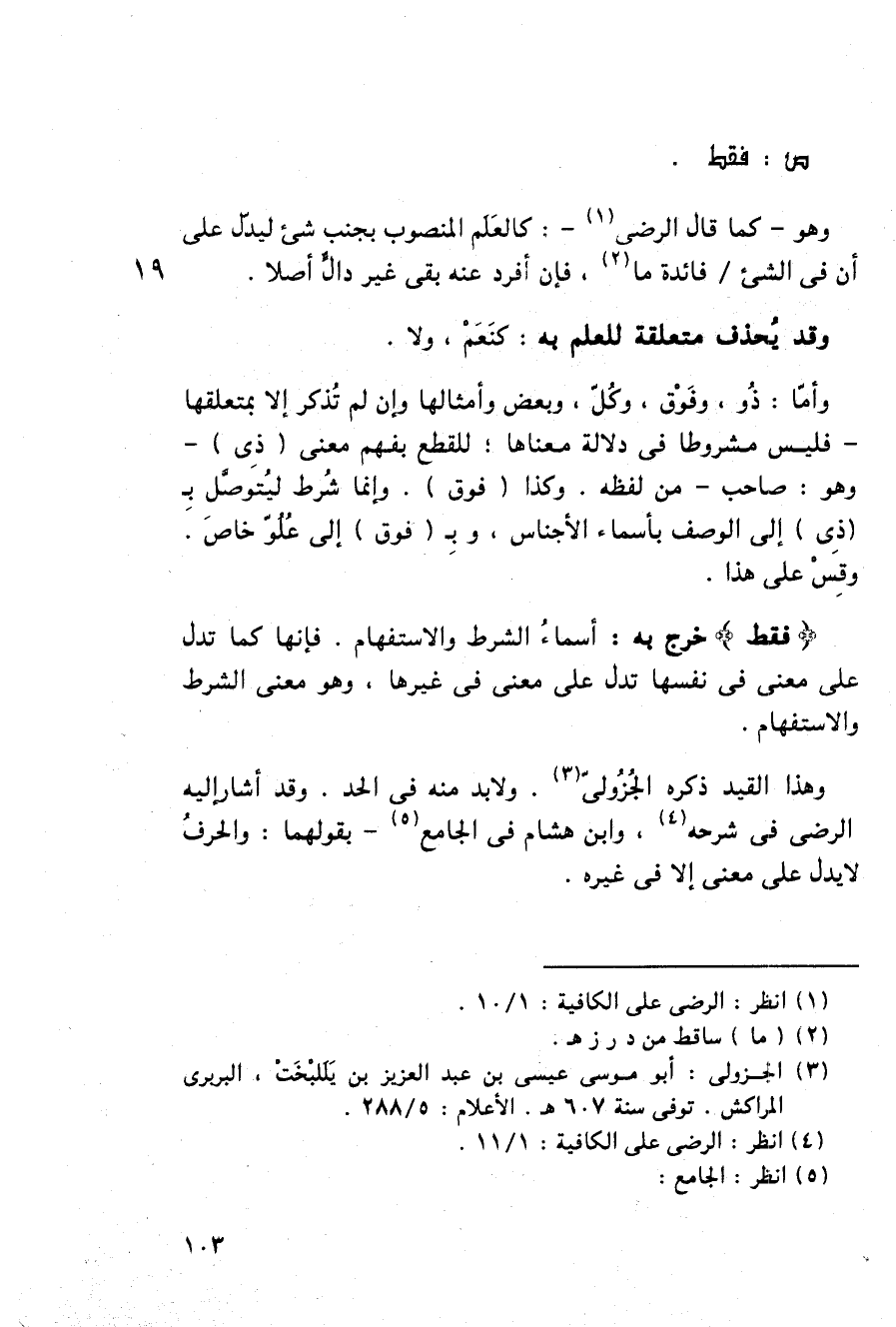 وهذا القيد ذكره الجزولى. ولابد منه في الحد. وقد أشار إليه الرضى في شرحه, وابن هشام في الجامع - بقولهما: والحرف لا يدل على معنى إلا في غيره.