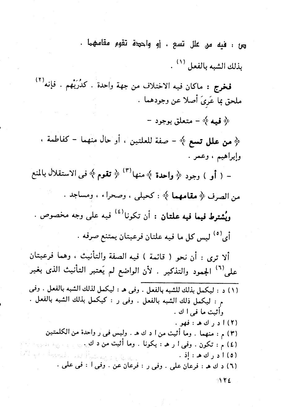- (أو) وجود {واحدة} منها {تقوم} في الاستقلال بالمنع من الصرف {مقامهما}: كحبلى, وصحراء, ومساحد.