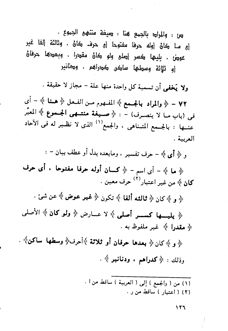 72 - {والمراد بالجمع} المفهوم من الفعل {هنا} - أي في (باب ما لا ينصرف) -: {صيغة منتهى الجموع} المعبر عنها: بالجمع المتناهى, والجمع الذي لا نظير له في الآحاد العربية.