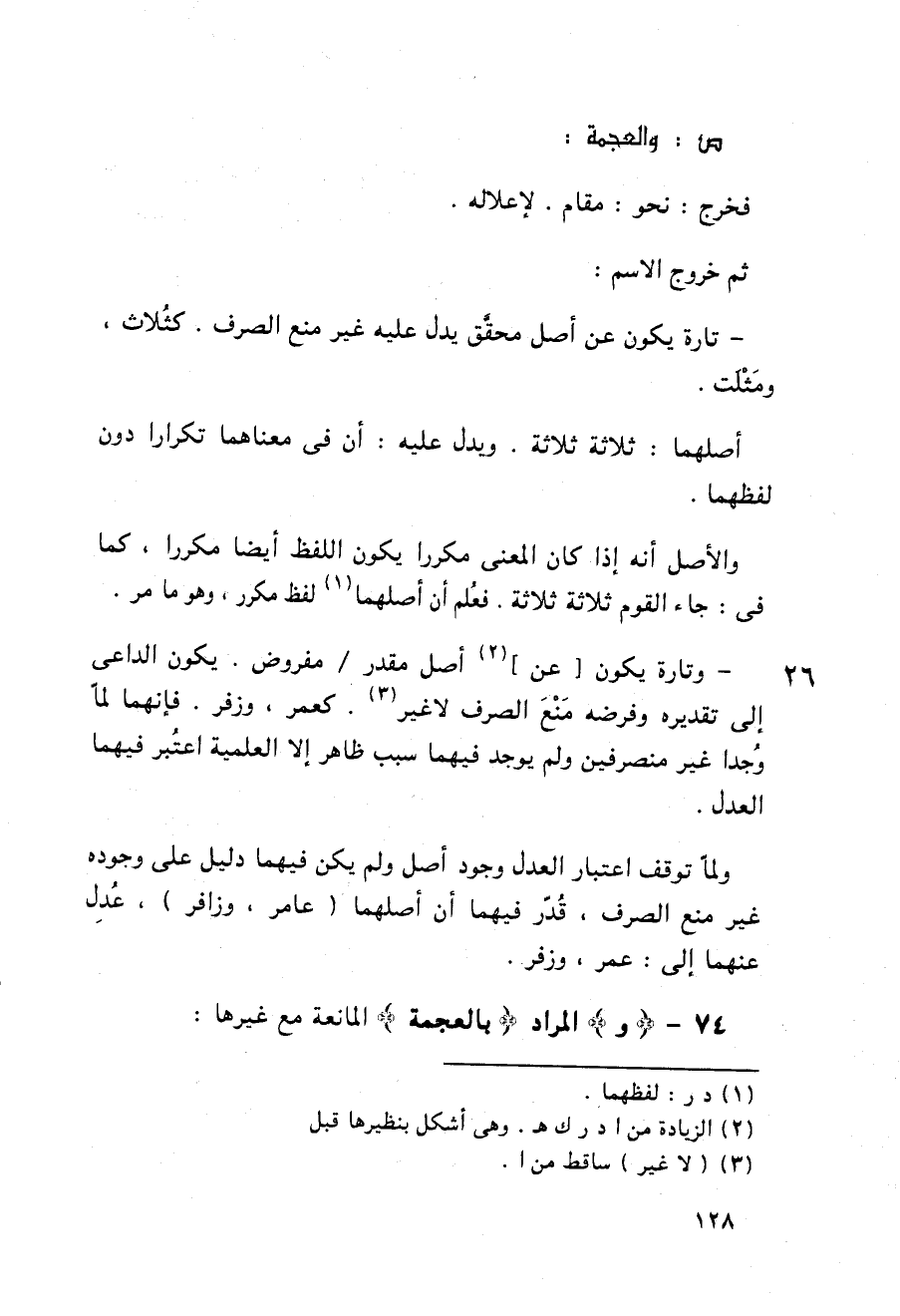 26 - وتارة يكون [عن] أصل مقدر / مفروض. يكون الداعى إلى تقديره وفرضه منع الصرف لا غير. كعمر, وزفر. فإنهما لما وجدا غير متصرفين ولم يوجد فيهما سبب ظاهر إلا العلمية اعتبر فيهما العدل.