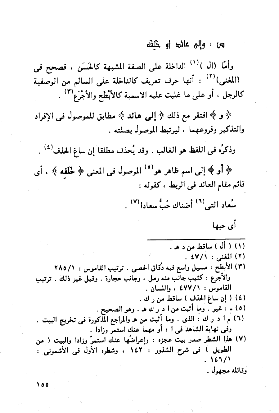{و} افتقر مع ذلك {إلى عائد} مطابق للموصول في الإفراد والتذكير وفروعهما, ليرتبط الموصول بصلته.