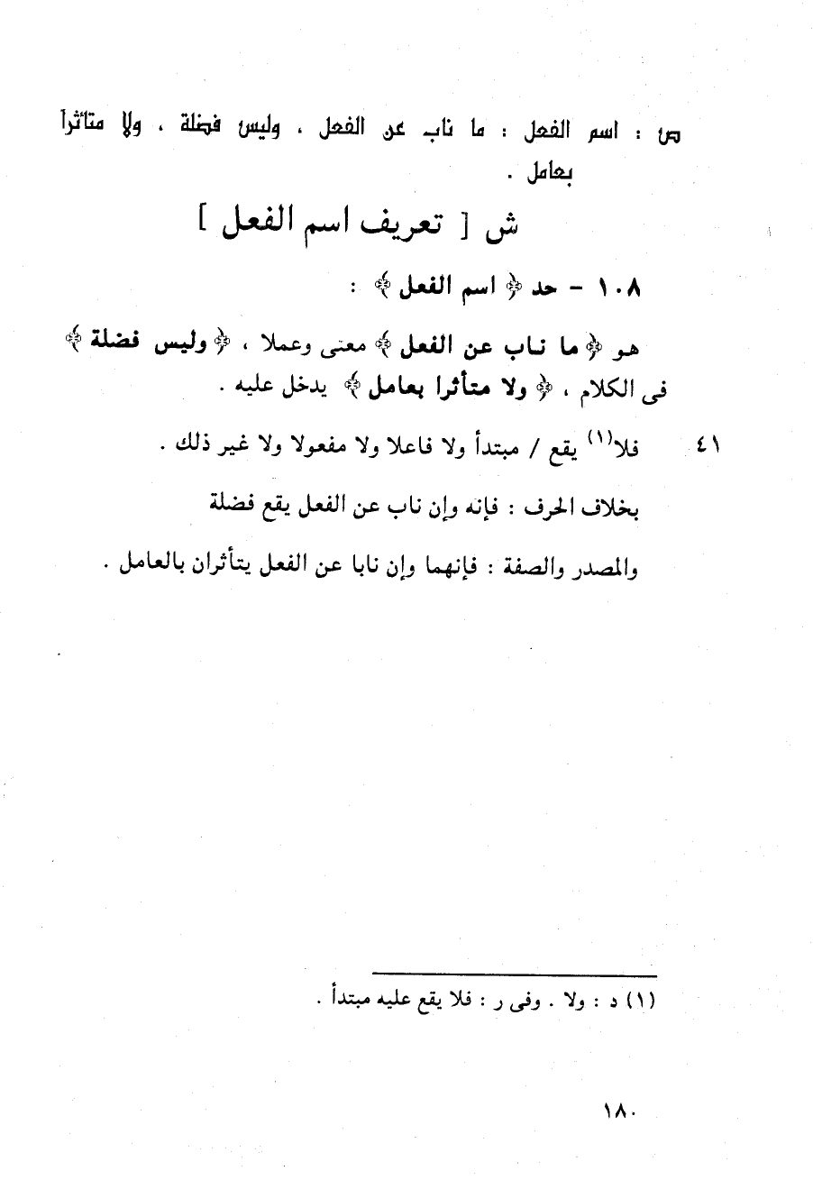 ص: اسم الفعل: ما ناب عن الفعل, وليس فضلة, ولا متأثرا بعامل.