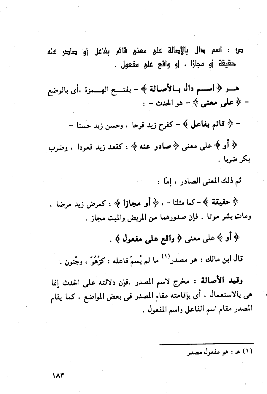 - {قائم بفاعل} - كفرح زيد فرحا, وحسن زيد حسنا - {أو} على معنى {صادر عنه}: كقعد زيد قعودا, وضرب بكر ضربا.
