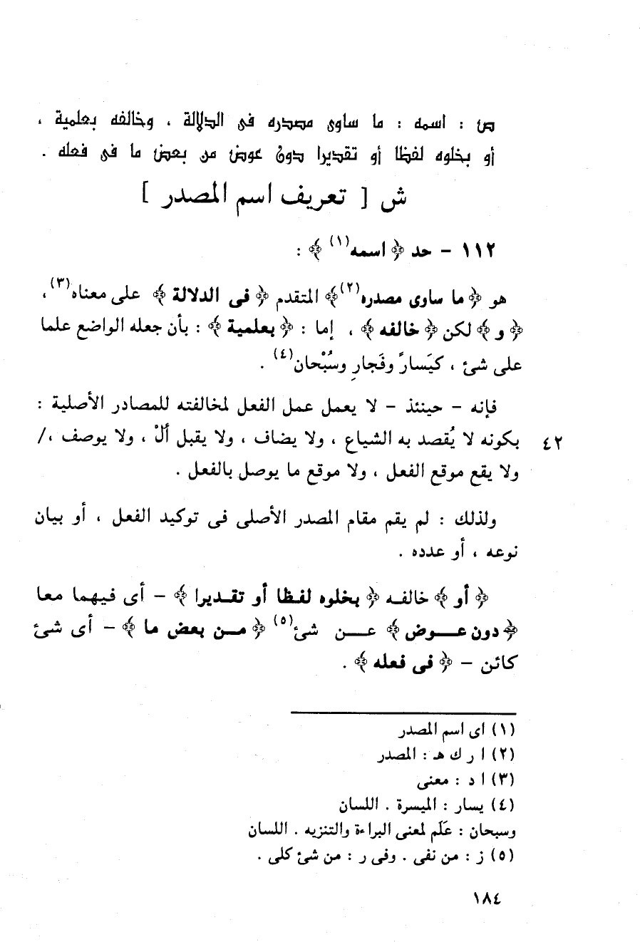 ص: اسمه: ما ساوى مصدره في الدلالة, وخالفه بعلمية, أو بخلوه لفظا أو تقديرا دون عوض من بعض ما في فعله.