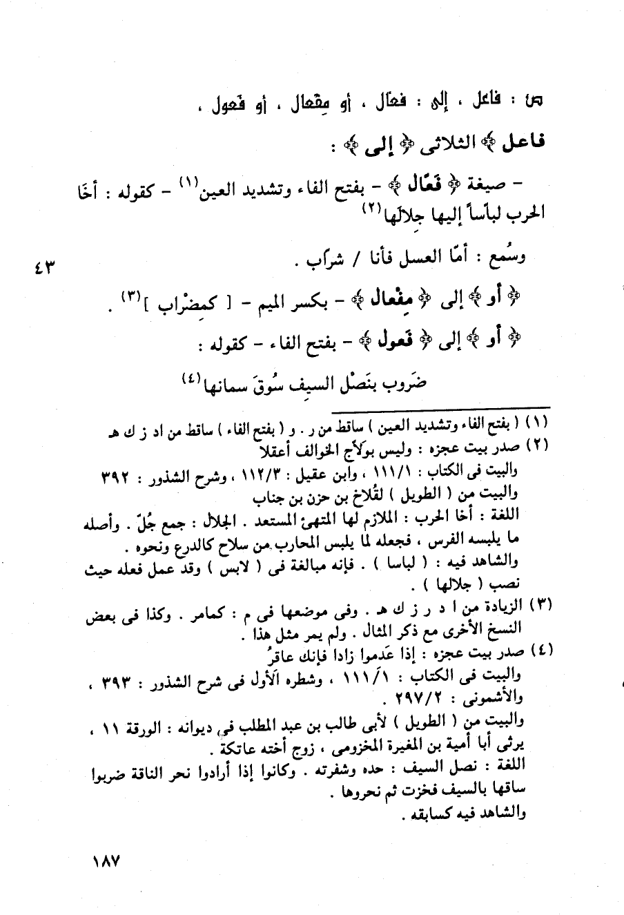 - صيغة {فعال} - بفتح الفاء وتشديد العين - كقوله: أخا الحرب لباسا إليها جلالها
