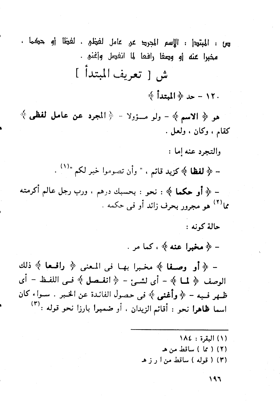 ص: المبتدأ, الاسم المجرد عن عامل لفظي, لفظا أو حكما, مخبرا عنه أو وصفا رافعا لما انفصل وأغنى.