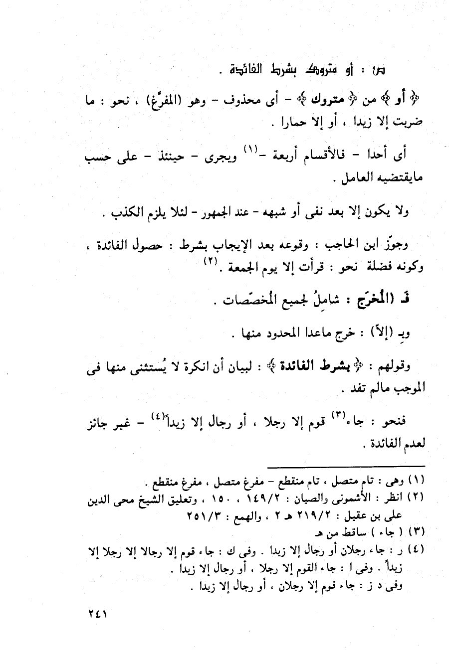 وقولهم: {بشرط الفائدة}: لبيان أن لنكرة لا يستثنى منها فى الموجب ما لم تفد.