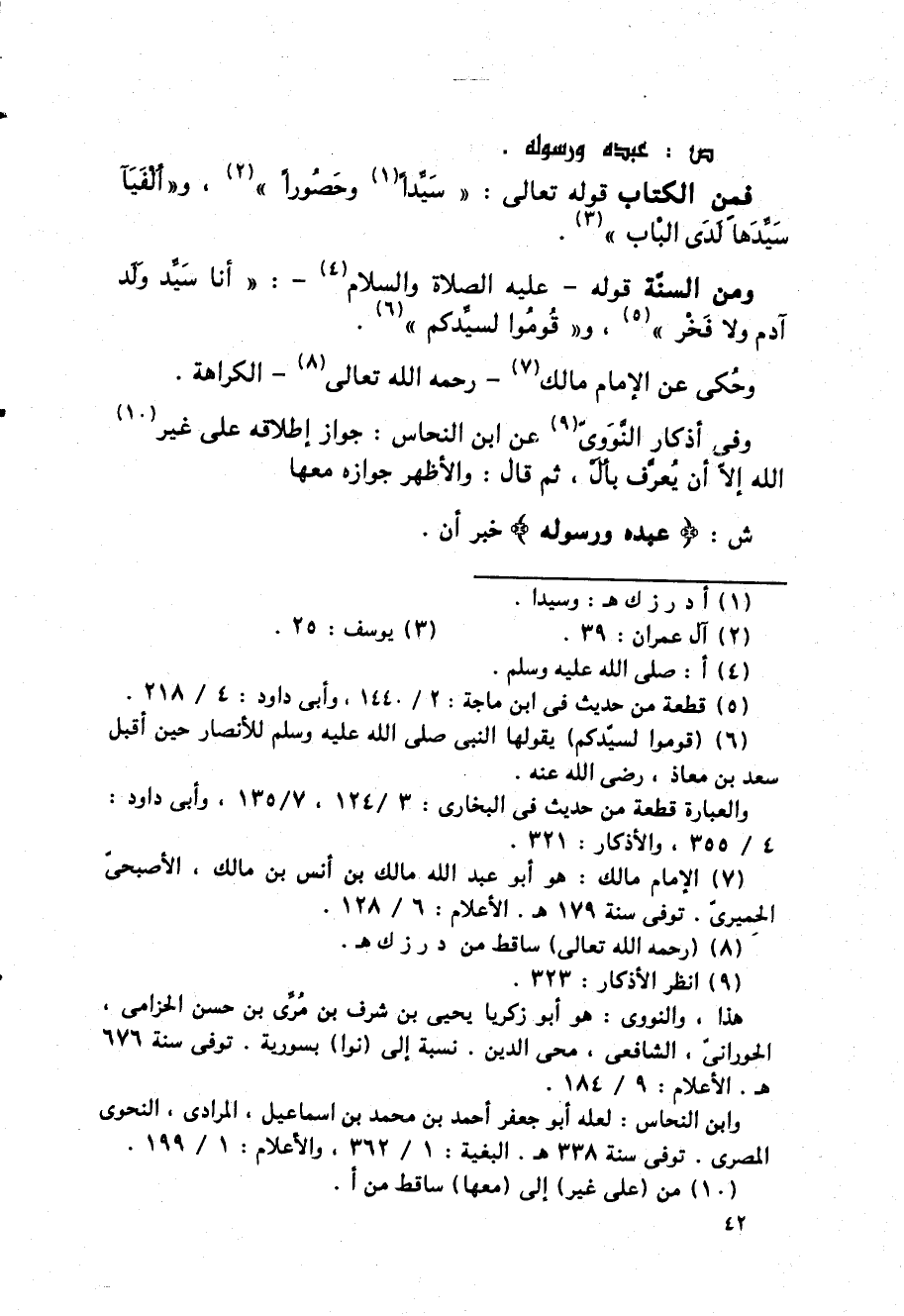 ومن السنة قوله - عليه الصلاة والسلام -: «أنا سيد ولد آدم ولا فخر» , و «قوموا لسيدكم».