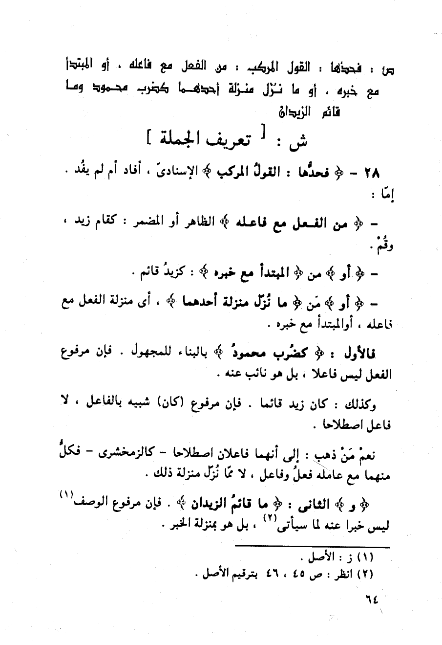 ص: فحدها: القول المركب: من الفعل مع فاعله, أو المبتدأ مع خبره, أو ما نزل منزلة أحدهما كضرب محمود وما قائم الزيدان