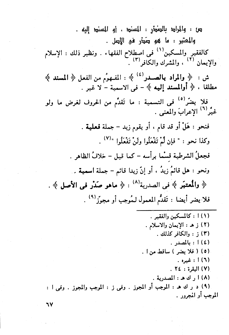 ش: {والمراد بالصدر}: المفهوم من الفعل {المسند} مطلقا, {أو المسند إليه} - في الاسمية - لا غير.