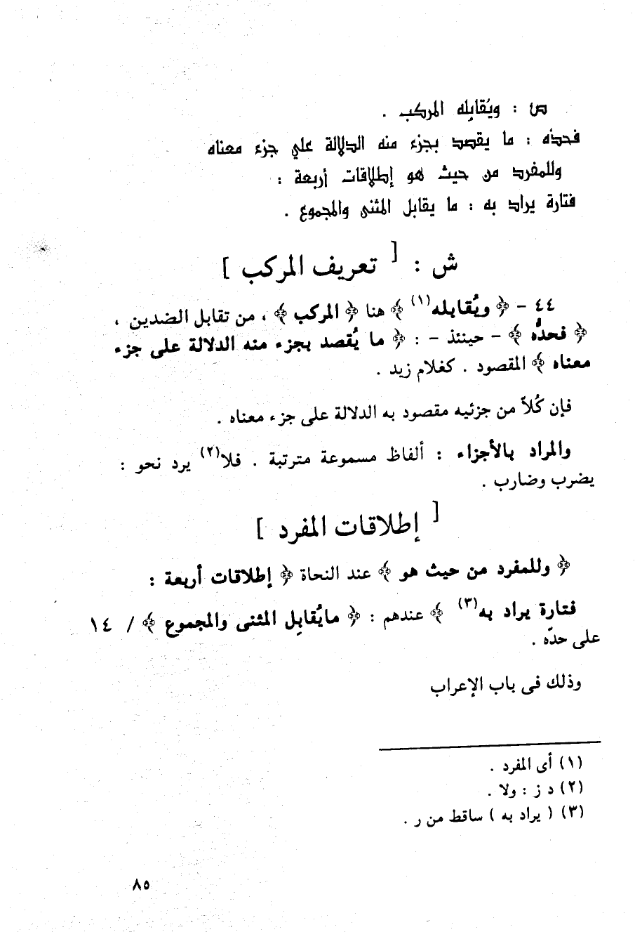 {وللمفرد من حيث هو} عند لنحاة {إطلاقات أربعة: فتارة يراد به} عندهم: {ما يقابل المثنى والمجموع} / 14 على حده.