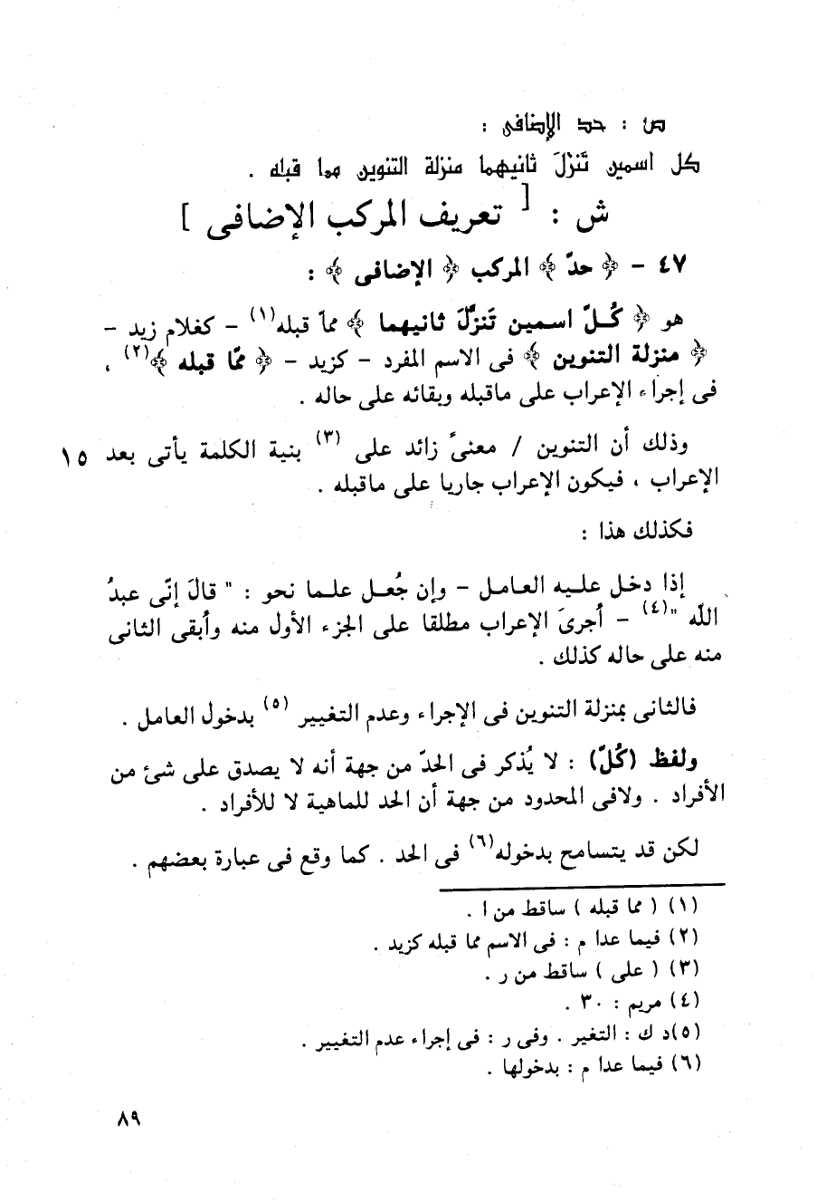 هو {كل اسمين تنزل ثانيهما} مما قبله - كغلام زيد - في إجراء الإعراب على ما قبله وبقائه على حاله. وذلك أن التنوين / معنى زائد على بنية الكلمة يأتى بعد 15 الإعراب, فيكون الإعراب جاريا على ما قبله.
