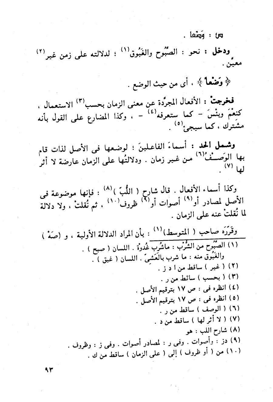 وكذا أسماء الأفعال. قال شارح (اللب): فإنها موضوعة في الأصل لمصادر أو أصوات أو ظروف, ثم نقلت, ولا دلالة لما نقلت عنه على الزمان.