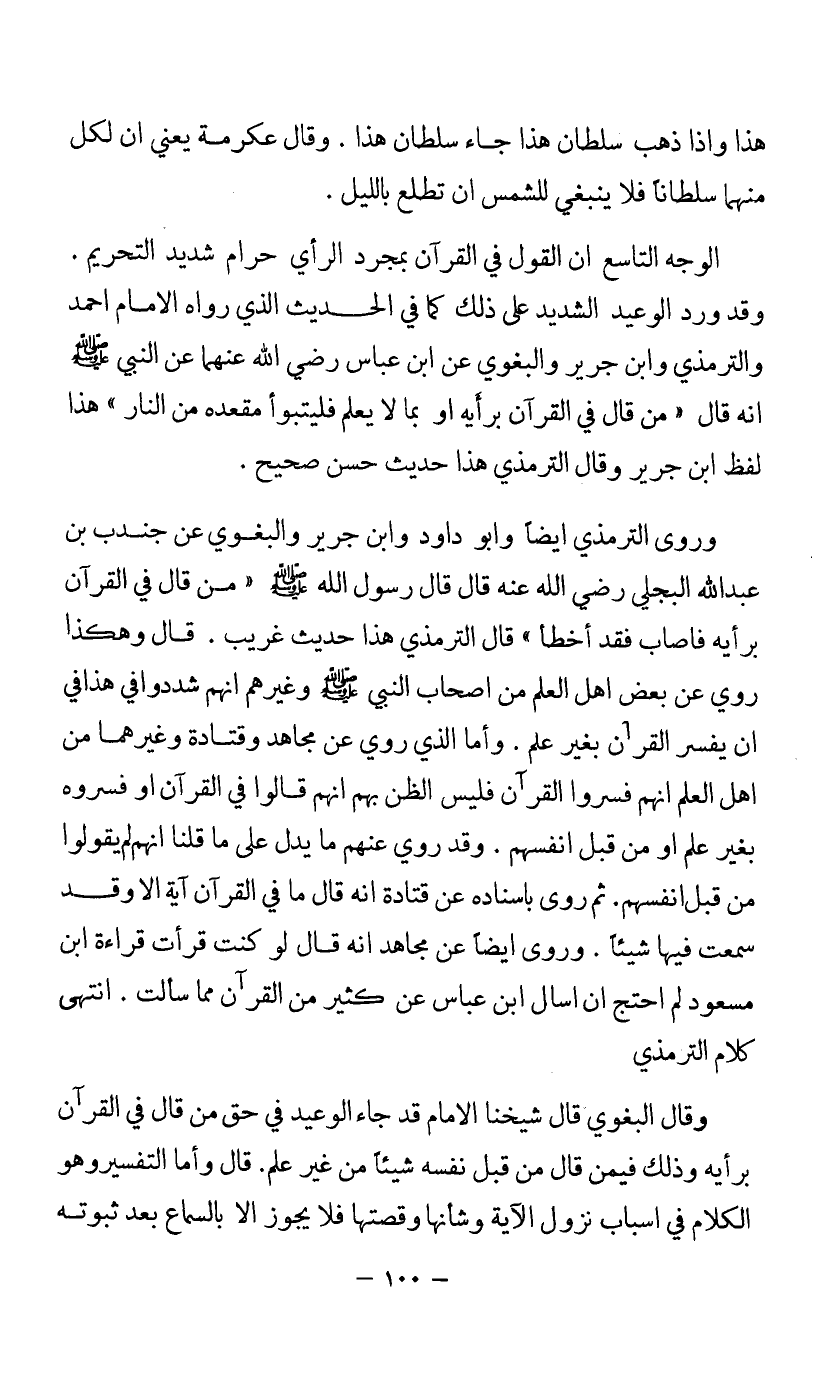 الوجه التاسع: أن القول في القرآن بمجرد الرأي حرام شديد التحريم، وقد ورد الوعيد الشديد على ذلك كما في الحديث الذي رواه الإمام أحمد والترمذي وابن جرير والبغوي عن ابن عباس رضي الله عنهما عن النبي - صلى الله عليه وسلم - أنه قال «من قال في القرآن برأيه أو بما لا يعلم فليتبوأ مقعده من النار» هذا لفظ ابن جرير وقال الترمذي هذا حديث حسن صحيح.
