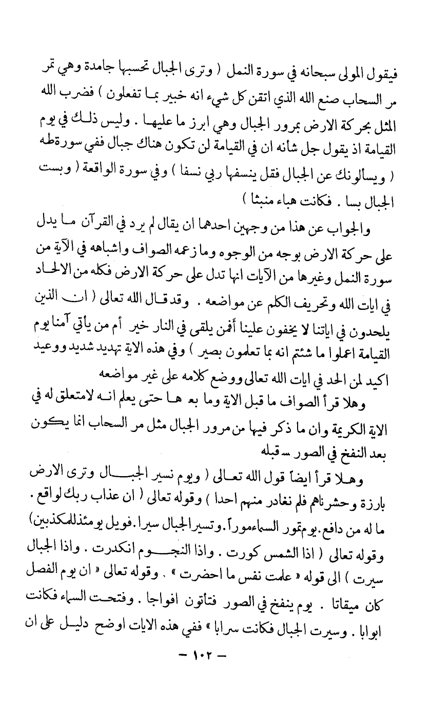والجواب عن هذا من وجهين أحدهما أن يقال لم يرد في القرآن ما يدل على حركة الأرض بوجه من الوجوه، وما زعمه الصواف وأشباهه في الآية من سورة النمل وغيرها من الآيات أنها تدل على حركة الأرض فكله من الإلحاد في آيات الله وتحريف الكلم عن مواضعه، وقد قال الله تعالى: {إِنَّ الَّذِينَ يُلْحِدُونَ فِي آَيَاتِنَا لَا يَخْفَوْنَ عَلَيْنَا أَفَمَنْ يُلْقَى فِي النَّارِ خَيْرٌ أَمْ مَنْ يَاتِي آَمِنًا يَوْمَ الْقِيَامَةِ اعْمَلُوا مَا شِئْتُمْ إِنَّهُ بِمَا تَعْمَلُونَ بَصِير} وفي هذه الآية تهديد شديد ووعيد أكيد لمن ألحد في آيات الله تعالى ووضع كلامه على غير مواضعه.
