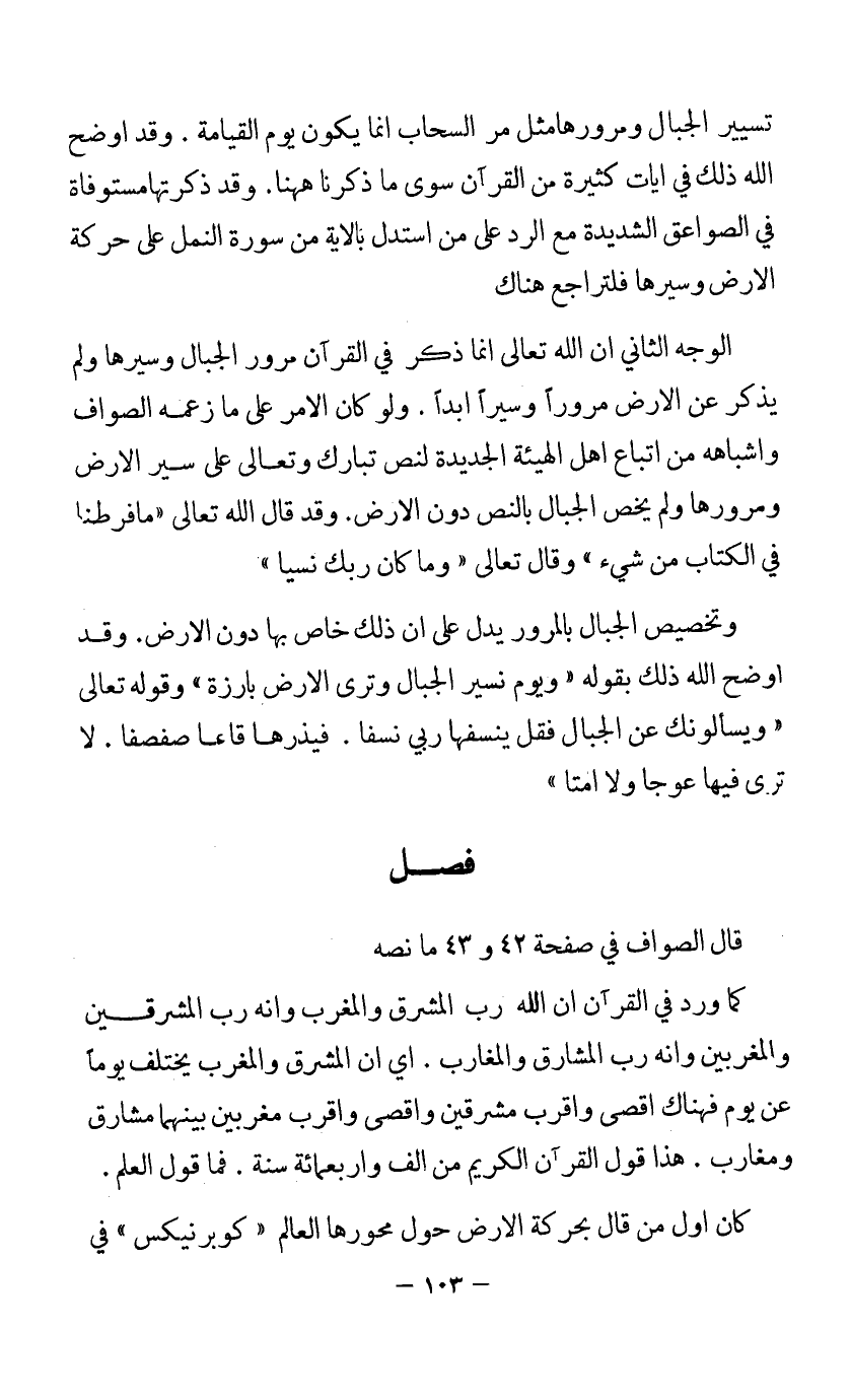 الوجه الثاني: أن الله تعالى ذكر في القرآن مرور الجبال وسيرها، ولم يذكر عن الأرض مرورا وسيرا أبدا، ولو كان الأمر على ما زعمه الصواف وأشباهه من أتباع أهل الهيئة الجديدة لنص تبارك وتعالى على سير الأرض ومرورها ولم يخص الجبال بالنص دون الأرض. وقد قال الله تعلى {مَا فَرَّطْنَا فِي الْكِتَابِ مِنْ شَيْءٍ} وقال تعالى {وَمَا كَانَ رَبُّكَ نَسِيًّا}.