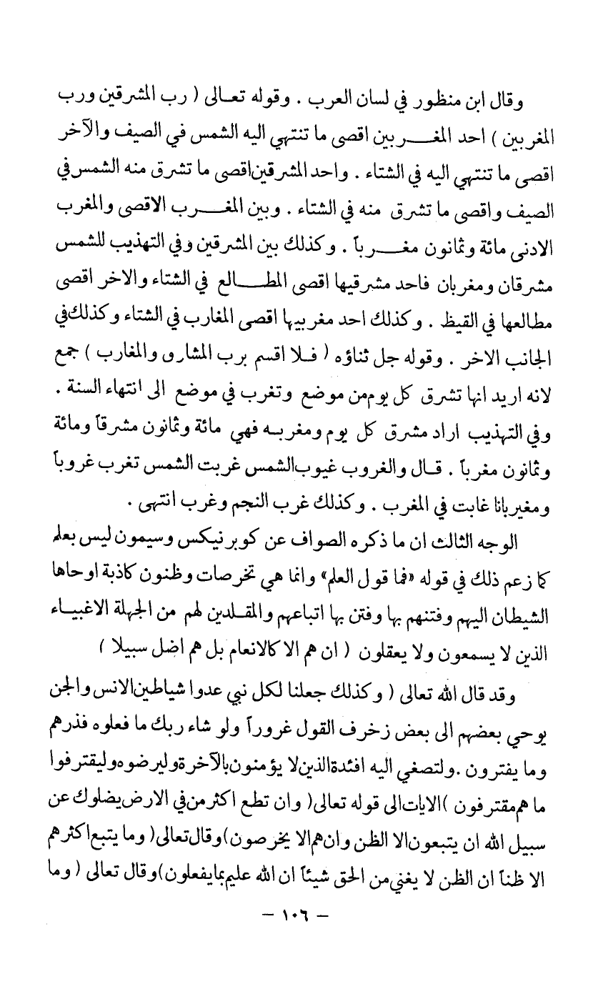 الوجه الثالث: أن ما ذكره الصواف عن كوبرنيكس وسيمون ليس بعلم كما زعم ذلك في قوله "فما قول العلم" وإنما هي تخرصات وظنون كاذبة أوحاها الشيطان إليهم وفتنهم بها وفتن بها أتباعهم والمقلدين لهم من الجهلة الأغبياء الذين لا يسمعون ولا يعقلون {إِنْ هُمْ إِلَّا كَالْأَنْعَامِ بَلْ هُمْ أَضَلُّ سَبِيلًا}.