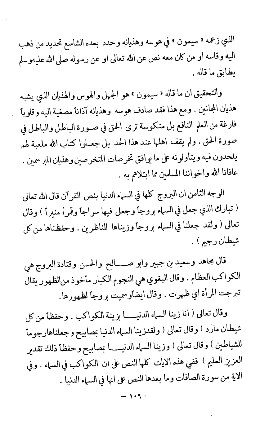 والتحقيق أن ما قاله "سيمون" هو الجهل والهوس والهذيان الذي يشبه هذيان المجانين، ومع هذا فقد صادف هوسه وهذيانه آذانا مصغية إليه وقلوبا فارغة من العلم النافع بل منكوسة ترى الحق في صورة الباطل والباطل في صورة الحق، ولم يقف أهلها عند هذا الحد بل جعلوا كتاب الله ملعبة لهم يلحدون فيه ويتأولونه على ما يوافق تخرصات المتخرصين وهذيان المبرسمين، عافانا الله وإخواننا المسلمين مما ابتلاهم به.