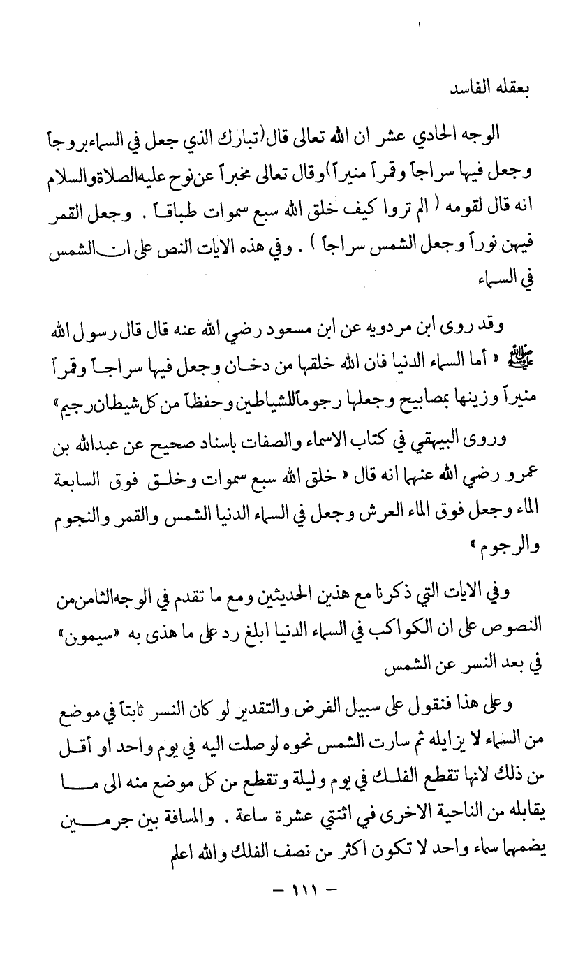 وفي الآيات التي ذكرنا مع هذين الحديثين ومع ما تقدم في الوجه الثامن من النصوص على أن الكواكب في السماء الدنيا أبلغ رد على ما هذى به "سيمون" في بعد النسر عن الشمس.