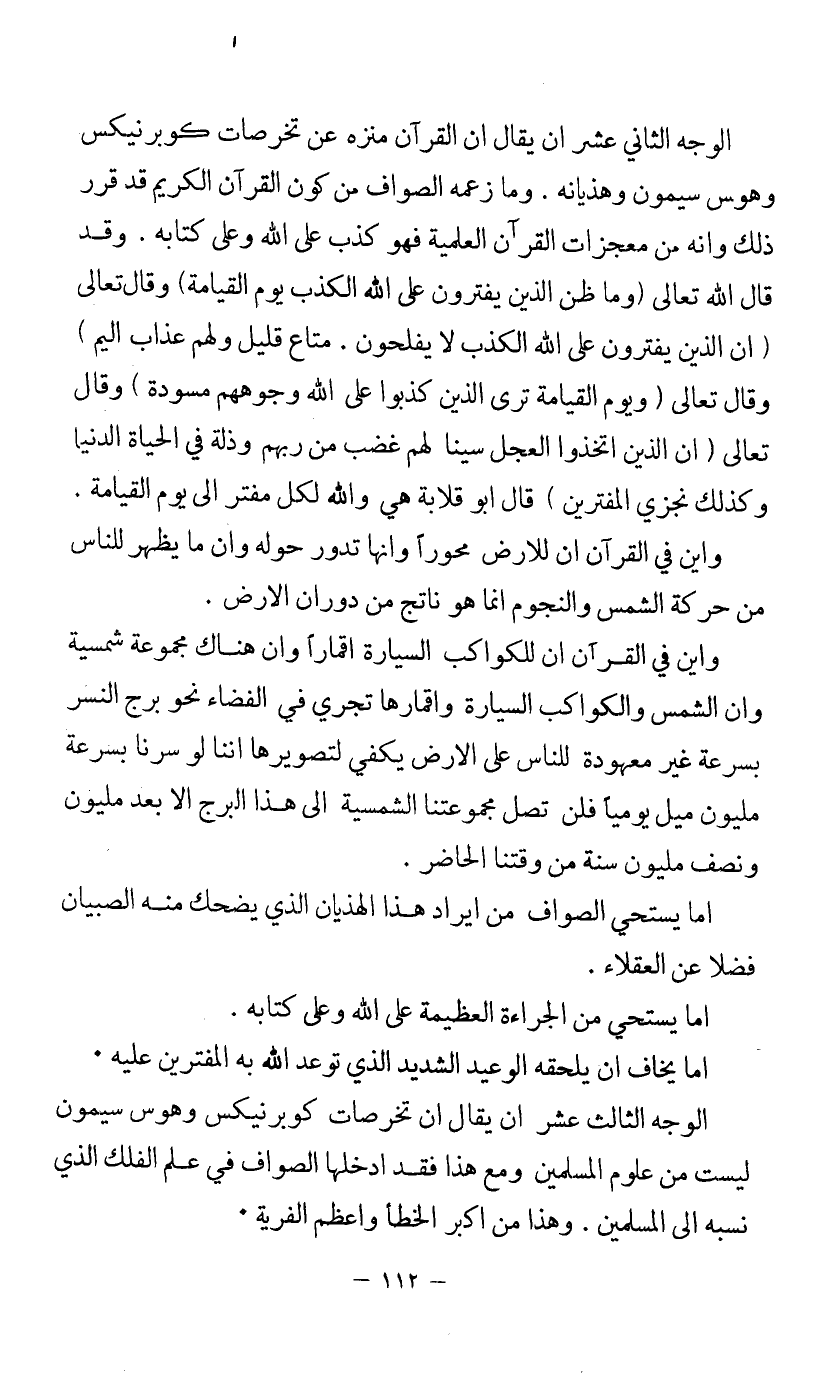 الوجه الثاني عشر: أن يقال أن القرآن منزه عن تخرصات كوبرنيكس وهوس سيمون وهذيانه، وما زعمه الصواف من كون القرآن الكريم قد قرر ذلك وأنه من معجزات القرآن العلمية فهو كذب على الله وعلى كتابه. وقد قال الله تعالى {وَمَا ظَنُّ الَّذِينَ يَفْتَرُونَ عَلَى اللَّهِ الْكَذِبَ يَوْمَ الْقِيَامَةِ} وقال تعالى {إِنَّ الَّذِينَ يَفْتَرُونَ عَلَى اللَّهِ الْكَذِبَ لَا يُفْلِحُونَ * مَتَاعٌ قَلِيلٌ وَلَهُمْ عَذَابٌ أَلِيمٌ} وقال تعالى {وَيَوْمَ الْقِيَامَةِ تَرَى الَّذِينَ كَذَبُوا عَلَى اللَّهِ وُجُوهُهُمْ مُسْوَدَّةٌ} وقال تعالى {إِنَّ الَّذِينَ اتَّخَذُوا الْعِجْلَ سَيَنَالُهُمْ غَضَبٌ مِنْ رَبِّهِمْ وَذِلَّةٌ فِي الْحَيَاةِ الدُّنْيَا وَكَذَلِكَ نَجْزِي الْمُفْتَرِينَ} قال أبو قلابة: هي والله لكل مفتر إلى يوم القيامة.