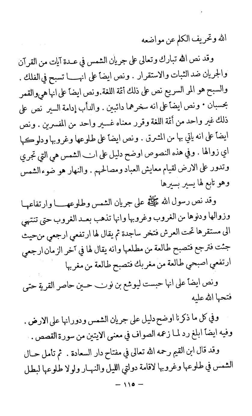 وقد نص الله تبارك وتعالى على جريان الشمس في عدة آيات من القرآن والجريان ضد الثبات والاستقرار، ونص أيضا على أنها تسبح في الفلك، والجريان ضد الثبات والاستقرار، ونص أيضا على أنها تسبح في الفلك، والسبح هو المر السريع نص على ذلك أئمة اللغة، ونص أيضا على أنها هي والقمر بحسبان، ونص أيضا على أنه سخرهما دائبين، والدأب إدامة السير، نص على ذلك غير واحد من أئمة اللغة، وقرر معناه غير واحد من المفسرين، ونص أيضا على أنه يأتي بها من المشرق، ونص أيضا على طلوعها وغروبها ودلوكها أي زوالها، وفي هذه النصوص أوضح دليل على أن الشمس هي التي تجري وتدور على الأرض لقيام معايش العباد ومصالحهم، والنهار هو ضوء الشمس وهو تابع لها يسير بسيرها.