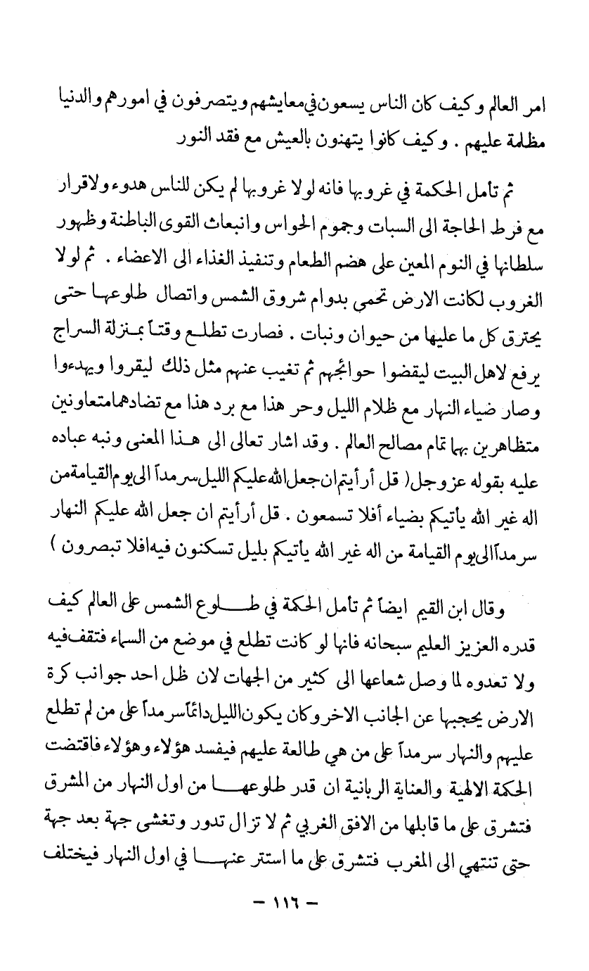 وقال ابن القيم أيضا: "ثم تأمل الحكمة في طلوع الشمس على العالم كيف قدره العزيز العليم سبحانه، فإنها لو كانت تطلع في موضع من السماء فتقف فيه ولا تعدوه لما وصل شعاعها إلى كثير من الجهات؛ لأن ظل أحد جوانب كرة الأرض يحجبها عن الجانب الآخر، وكان يكون الليل دائما سرمدا على من لم تطلع عليهم، والنهار سرمدا على من هي طالعة عليهم، فيفسد هؤلاء وهؤلاء، فاقتضت الحكمة الإلهية والعناية الربانية أن قدر طلوعها من أول النهار من المشرق، فتشرق على ما قابلها من الأفق الغربي، ثم لا تزال تدور وتغشى جهة بعد جهة حتى تنتهي إلى المغرب فتشرق على ما استتر عنها في أول النهار، فيختلف