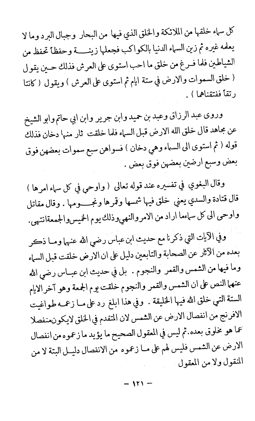 وفي الآيات التي ذكرنا مع حديث ابن عباس رضي الله عنهما وما ذكر بعده من الآثار عن الصحابة والتابعين دليل على أن الأرض خلقت قبل السماء وما فيها من الشمس والقمر والنجوم. بل في حديث ابن عباس رضي الله عنهما النص على أن الشمس والقمر والنجوم خلقت يوم الجمعة وهو آخر الأيام الستة التي خلق الله فيها الخليقة، وفي هذا أبلغ رد على ما زعمه طواغيت الافرنج من انفصال الأرض عن الشمس لأن المتقدم في الخلق لا يكون منفصلا عما هو مخلوق بعده، ثم ليس في المعقول الصحيح ما يؤيد ما زعموه من انفصال الأرض عن الشمس فليس لهم على ما زعموه من الانفصال دليل البتة لا من المنقول ولا من المعقول.