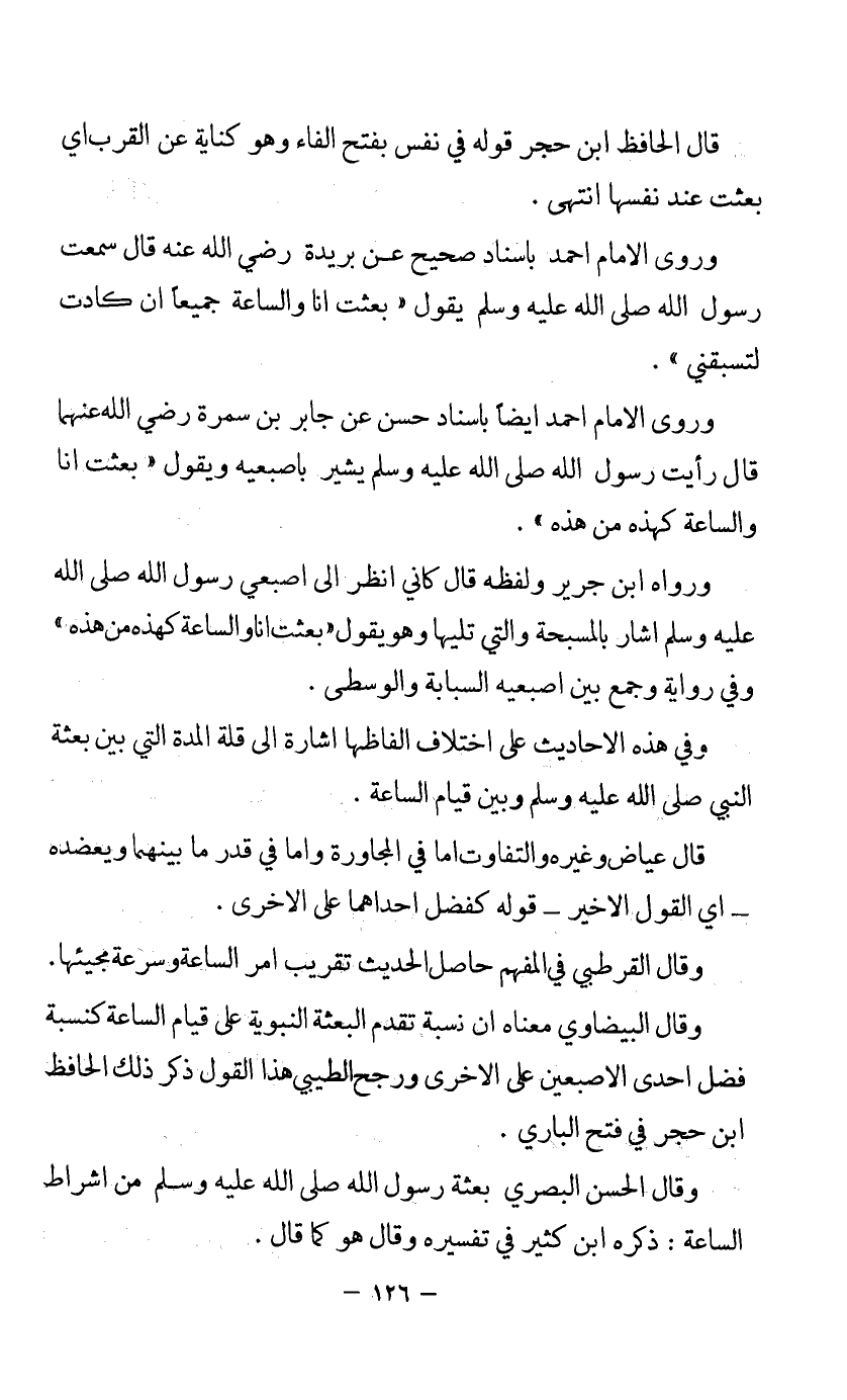 ورواه ابن جرير ولفظه قال كأني أنظر إلى أصبعي رسول الله - صلى الله عليه وسلم - أشار بالمسبحة والتي تليها وهو يقول «بعثت أنا والساعة كهذه من هذه»، وفي رواية وجمع بين أصبعيه السبابة والوسطى.