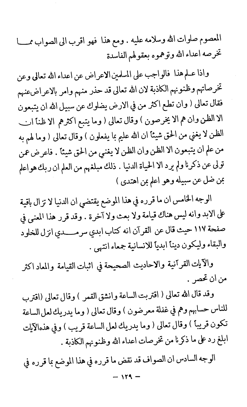 الوجه الخامس: أن ما قرره في هذا الموضع يقتضي أن الدنيا لا تزال باقية على الأبد، وأنه ليس هناك قيامة ولا بعث ولا آخرة، وقد قرر هذا المعنى في صفحة 117 حيث قال عن القرآن أنه كتاب أبدي سرمدي أنزل للخلود والبقاء وليكون دينا أبديا للإنسانية جمعاء. انتهى.