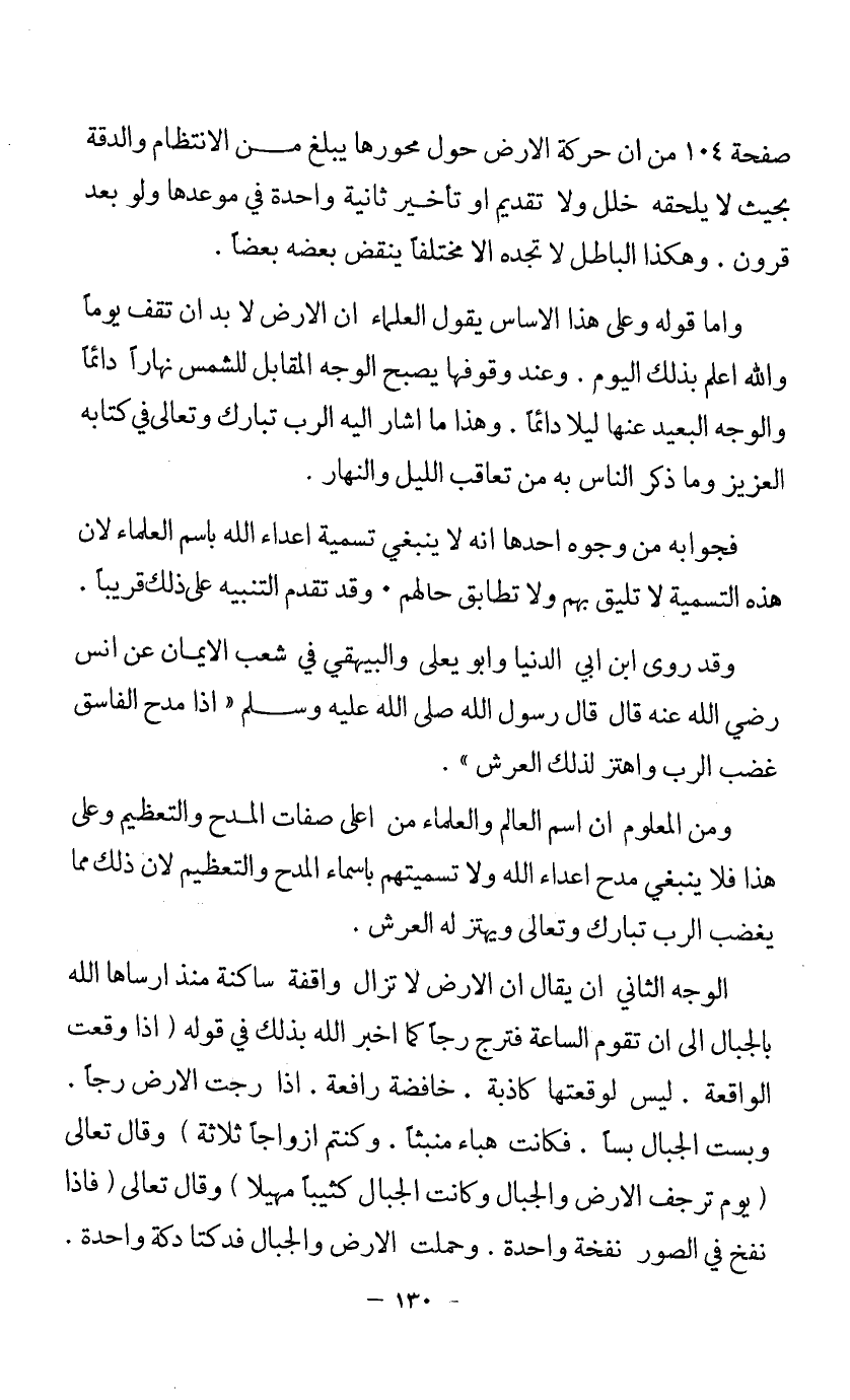 صفحة 104 من أن حركة الأرض حول محورها يبلغ من الانتظام والدقة بحيث لا يلحقه خلل ولا تقديم أو تأخير ثانية واحدة في موعدها ولو بعد قرون، وهكذا الباطل لا تجده إلا مختلفا ينقض بعضه بعضا.