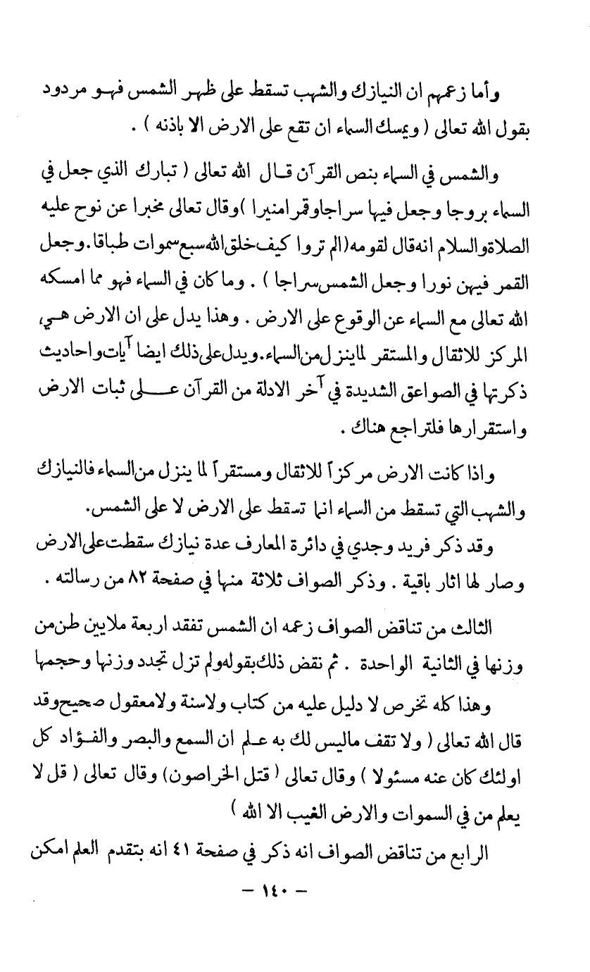 وأما زعمهم أن النيازك والشهب تسقط على ظهر الشمس، فهو مردود بقول الله تعالى {وَيُمْسِكُ السَّمَاءَ أَنْ تَقَعَ عَلَى الْأَرْضِ إِلَّا بِإِذْنِهِ}.