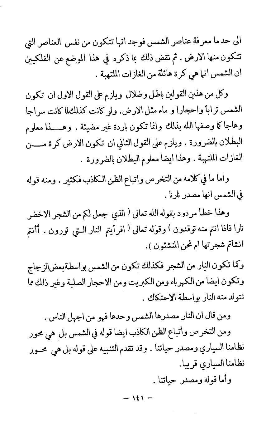 إلى حد ما معرفة عناصر الشمس، فوجد أنها تتكون من نفس العناصر التي تتكون منها الأرض، ثم نقض ذلك بما ذكره في هذا الموضع عن الفلكيين أن الشمس إنما هي كرة هائلة من الغازات الملتهبة.