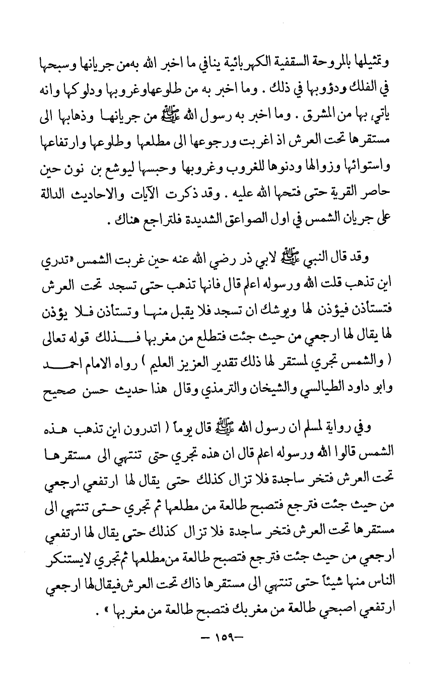 وتمثيلها بالمروحة السقفية الكهربائية ينافي ما أخبر الله به من جريانها وسبحها في الفلك ودؤوبها في ذلك، وما أخبر به من طلوعها وغروبها ودلوكها وأنه يأتي بها من المشرق، وما أخبر به رسول الله - صلى الله عليه وسلم - من جريانها وذهابها إلى مستقرها تحت العرش إذا غربت، ورجوعها إلى مطلعها وطلوعها وارتفاعها واستوائها وزوالها ودنوها للغروب وغروبها، وحبسها ليوشع بن نون حين حاصر القرية حتى فتحها الله عليه، وقد ذكرت الآيات والأحاديث الدالة على جريان الشمس في أول الصواعق الشديدة فلتراجع هناك.