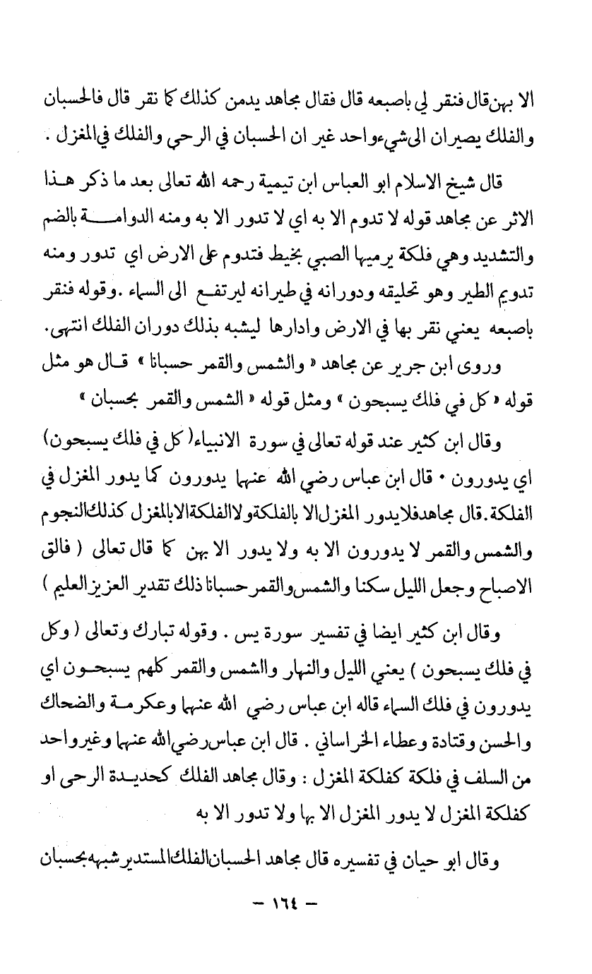 وقال ابن كثير عند قوله تعالى في سورة الأنبياء {كُلٌّ فِي فَلَكٍ يَسْبَحُونَ}: أي يدورون، قال ابن عباس رضي الله عنهما يدورون كما يدور المغزل في الفلكة، قال مجاهد فلا يدور المغزل إلا بالفلكة ولا الفلكة إلا بالمغزل، كذلك النجوم والشمس والقمر لا يدورون إلا به ولا يدور إلا بهن كما قال تعالى {فَالِقُ الْإِصْبَاحِ وَجَعَلَ اللَّيْلَ سَكَنًا وَالشَّمْسَ وَالْقَمَرَ حُسْبَانًا ذَلِكَ تَقْدِيرُ الْعَزِيزِ الْعَلِيمِ}.