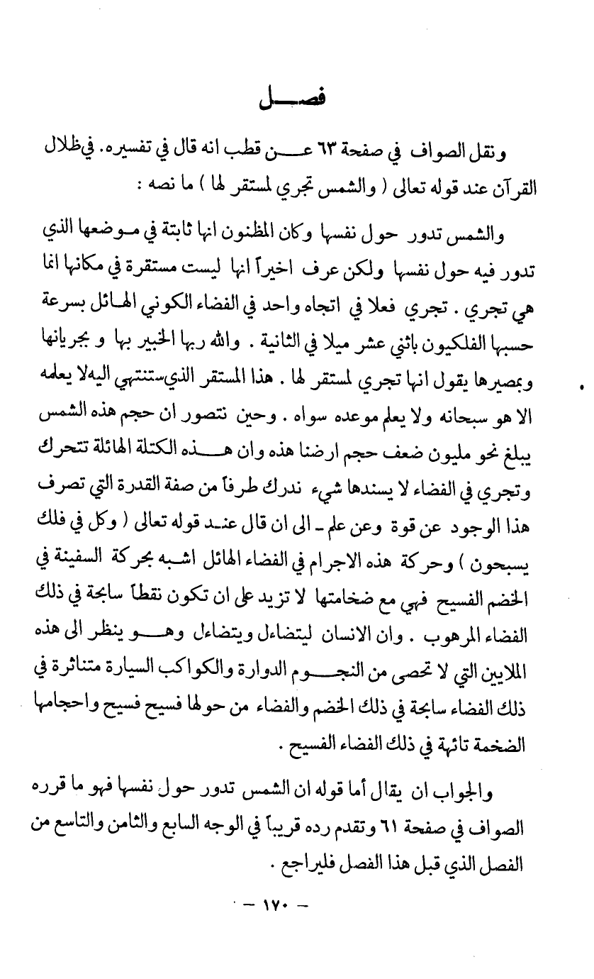 ونقل الصواف في صفحة 63 عن قطب أنه قال في تفسيره (في ظلال القرآن) عند قوله تعالى {وَالشَّمْسُ تَجْرِي لِمُسْتَقَرٍّ لَهَا} ما نصه: