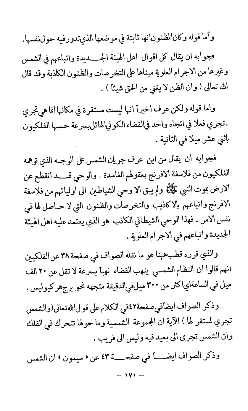 فجوابه أن يقال: من أين عرف جريان الشمس على الوجه الذي توهمه الفلكيون من فلاسفة الإفرنج بعقولهم الفاسدة، والوحي قد انقطع عن الأرض بموت النبي - صلى الله عليه وسلم - ولم يبق إلى وحي الشياطين إلى أوليائهم من فلاسفة الإفرنج وأتباعهم بالأكاذيب والتخرصات والظنون التي لا حاصل لها في نفس الأمر، فهذا الوحي الشيطاني الكاذب هو الذي يعتمد عليه أهل الهيئة الجديدة وأتباعهم في الأجرام العلوية.