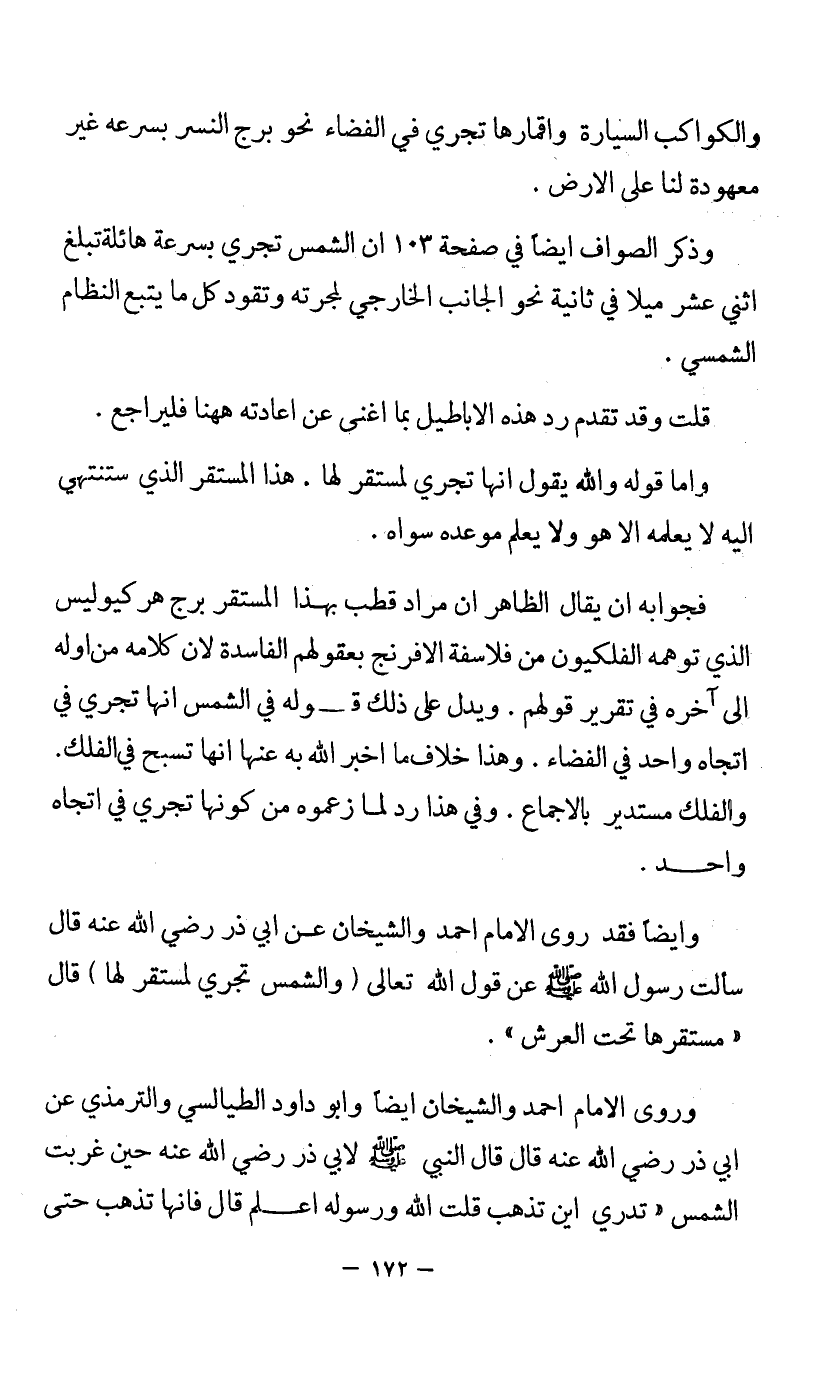 وذكر الصواف أيضا في صفحة 103 أن الشمس تجري بسرعة هائلة تبلغ اثني عشر ميلا في ثانية نحو الجانب الخارجي لمجرته، وتقود كل ما يتبع النظام الشمسي.