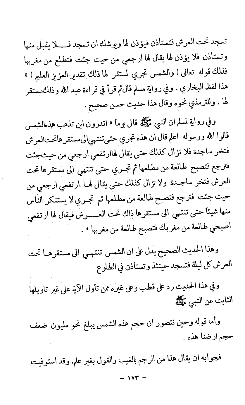 وفي رواية لمسلم أن النبي - صلى الله عليه وسلم - قال يوما «أتدرون أين تذهب هذه الشمس؟ قالوا الله ورسوله أعلم، قال: إن هذه تجري حتى تنتهي إلى مستقرها تحت العرش فتخر ساجدة، فلا تزال كذلك حتى يقال لها ارتفعي، ارجعي من حيث جئت فترجع فتصبح طالعة من مطلعها، ثم تجري حتى تنتهي إلى مستقرها تحت العرش فتخر ساجدة، ولا تزال كذلك حتى يقال لها: ارتفعي ارجعي من حيث جئت، فترجع فتصبح طالعة من مطلعها، ثم تجري لا يستنكر الناس منها شيئا حتى تنتهي إلى مستقرها ذاك تحت العرش، فيقال لها ارتفعي أصبحي طالعة من مغربك، فتصبح طالعة من مغربها».