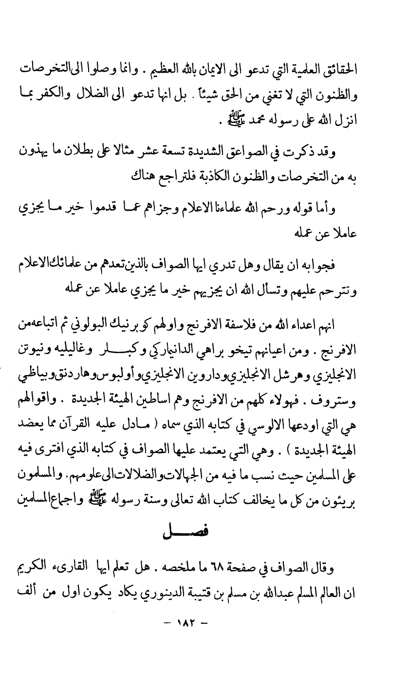 إنهم أعداء الله من فلاسفة الإفرنج, وأولهم كبرنيك البولوني ثم أتباعه من الإفرنج. ومن أعيانهم تيخوبراهي الدانماركي وكبلر وغاليليه ونيوتن الإنجليزي وهرشل الإنجليزي وداروين الإنجليزي وأولبوس وهاردنق وبياظي وستروف, فهؤلاء كلهم من الإفرنج وهم أساطين الهيئة الجديدة, وأقوالهم هي التي أودعها الألوسي في كتابه الذي سماه (ما دل عليه القرآن مما يعد الهيئة الجديدة). وهي التي يعتمد عليها الصواف في كتابه الذي افترى فيه على المسلمين حيث نسب ما فيه من الجهالات والضلالات إلى علومهم. والمسلمون بريئون من كل ما يخالف كتاب الله تعالى وسنة رسوله - صلى الله عليه وسلم - وإجماع المسلمين.