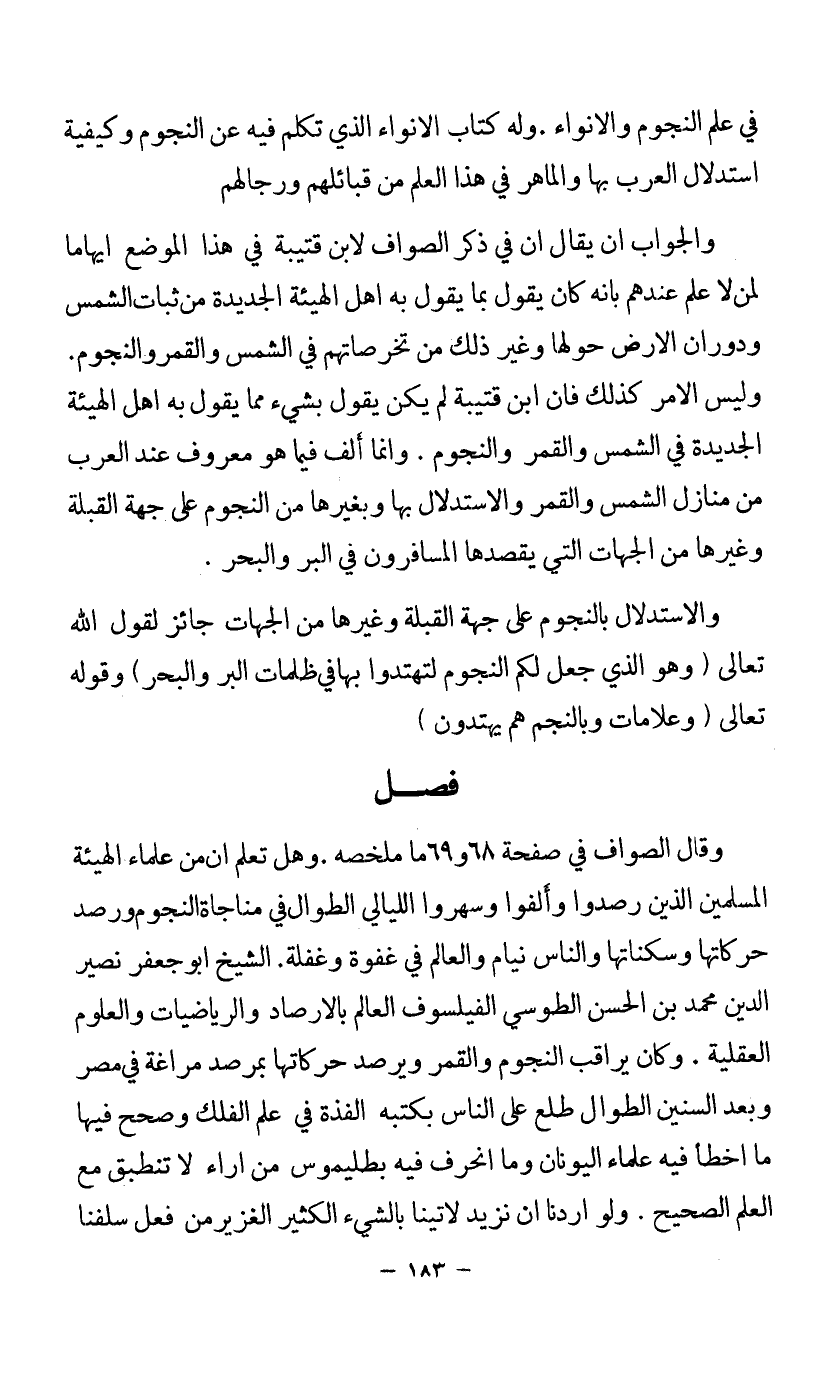 والجواب أن يقال إن في ذكر الصواف لابن قتيبة في هذا الموضع إيهاما لمن لا علم عندهم بأنه كان يقول بما يقول به أهل الهيئة الجديدة من ثبات الشمس ودوران الأرض حولها وغير ذلك من تخرصاتهم في الشمس والقمر والنجوم. وليس الأمر كذلك فإن ابن قتيبة لم يكن يقول بشيء مما يقول به أهل الهيئة الجديدة وإنما ألف فيما هو معروف عند العرب من منازل الشمس والقمر والاستدلال بها وبغيرها من النجوم على جهة القبلة وغيرها من الجهات التي يقصدها المسافرون في البر والبحر.