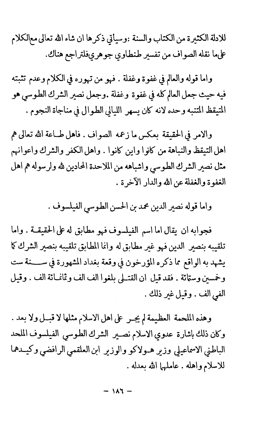 وأما قوله والعالم في غفوة وغفلة. فهو من تهوره في الكلام وعدم تثبته فيه حيث جعل العالم كله في غفوة وغفلة. وجعل نصير الشرك الطوسي هو المتيقظ المتنبه وحده, لأنه كان يسهر الليالي الطوال في مناجاة النجوم.