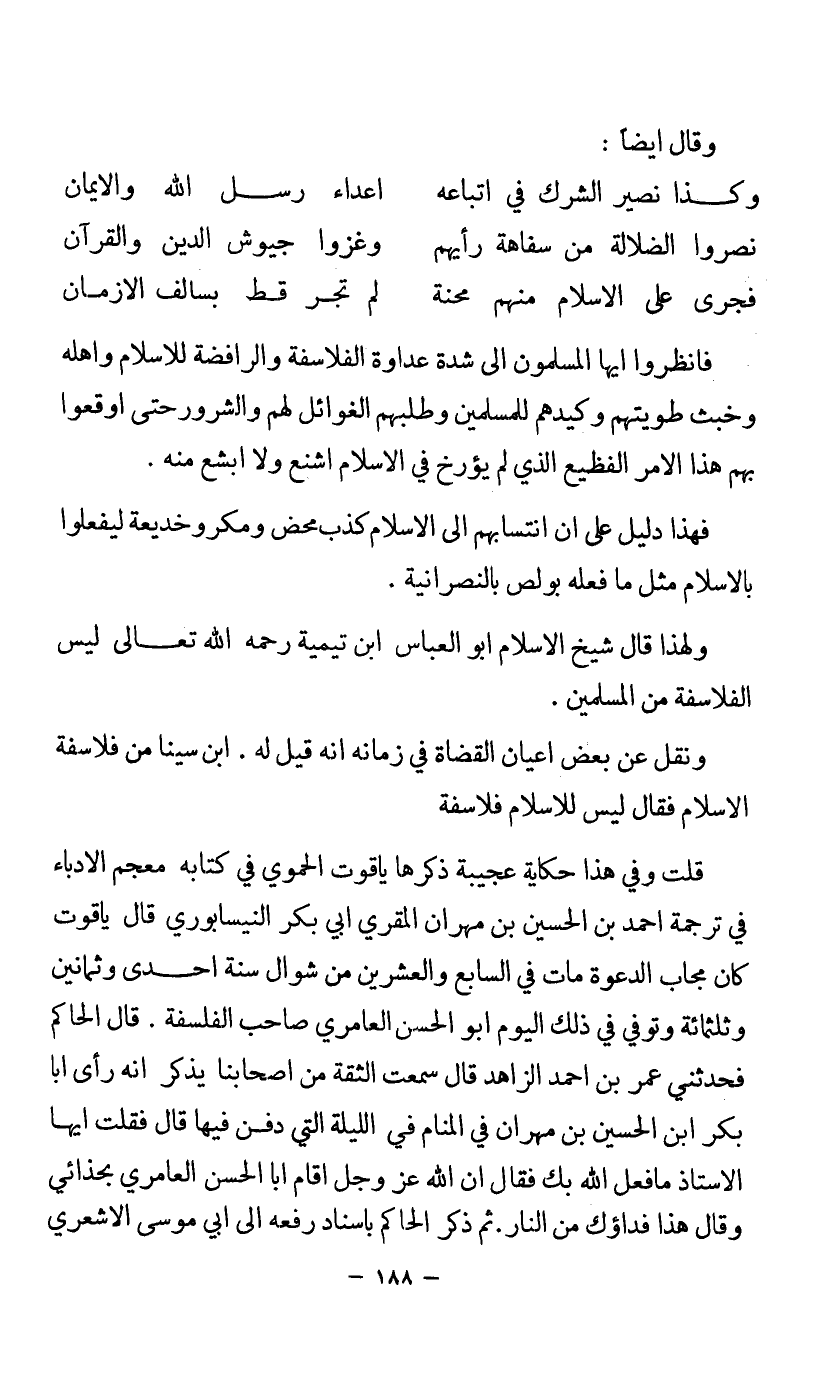 ونقل عن بعض أعيان القضاة في زمانه أنه قيل له. ابن سينا من فلاسفة الإسلام فقال ليس للإسلام فلاسفة.